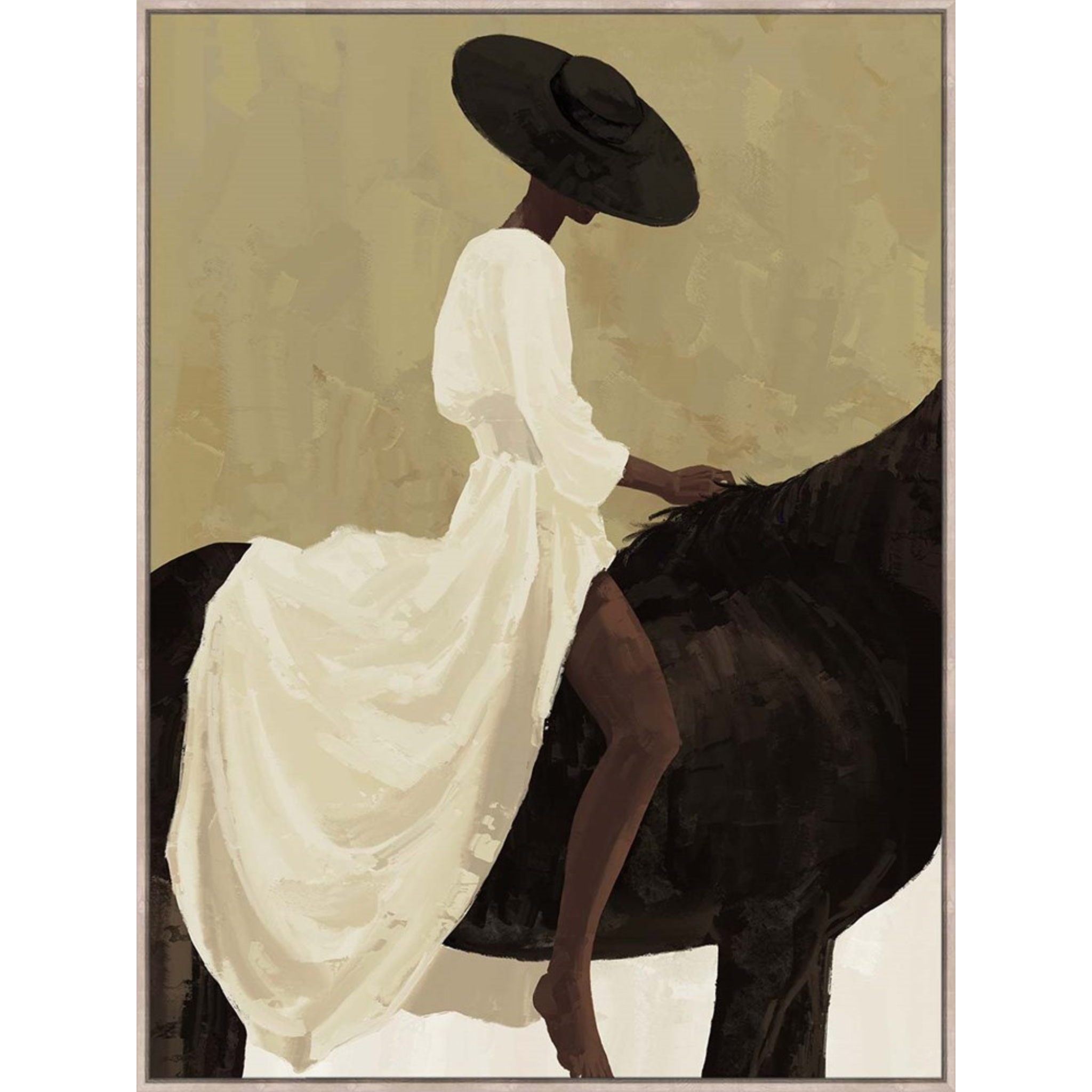 Art print - Female figure on horseback - with white dress and black hat. Natural toned frame.