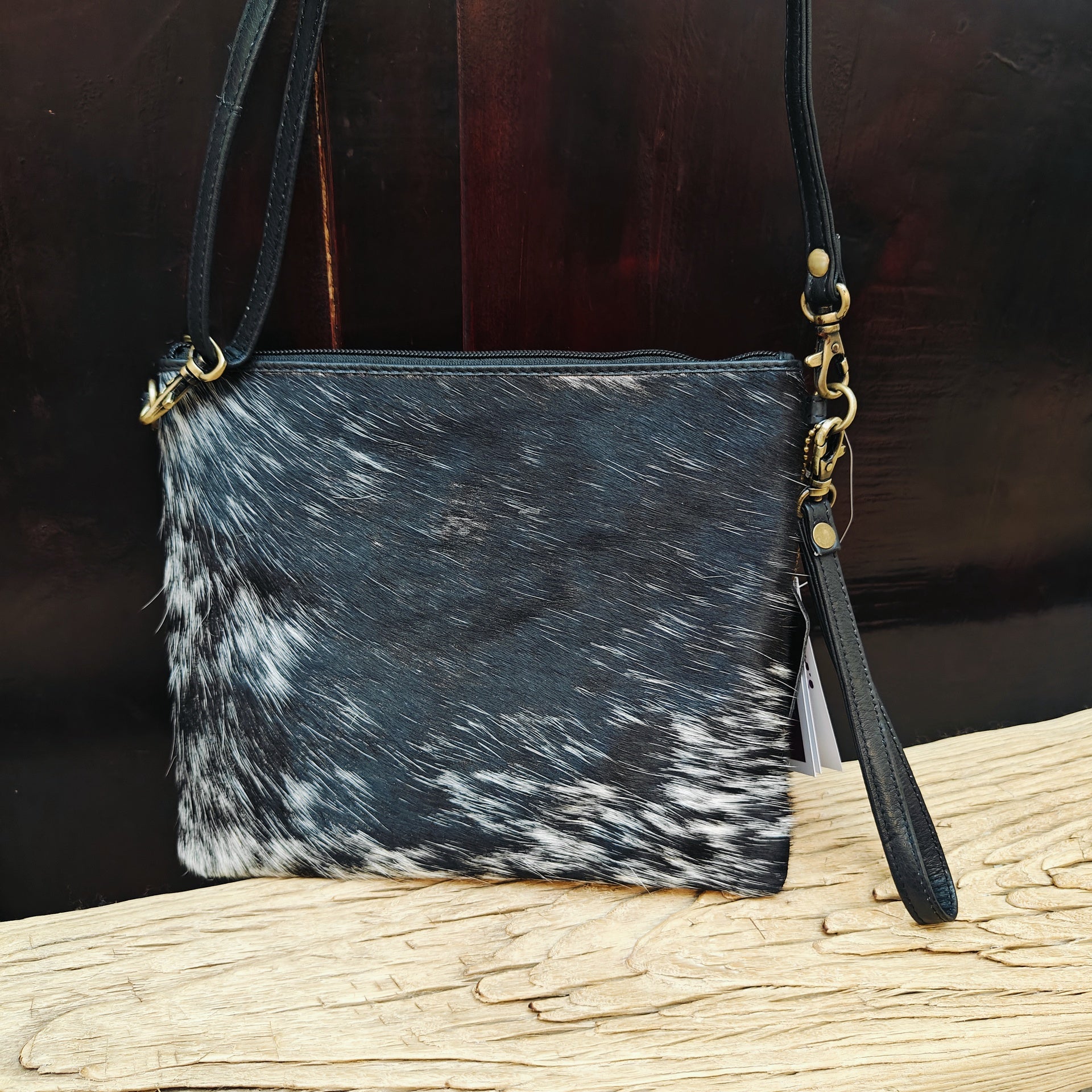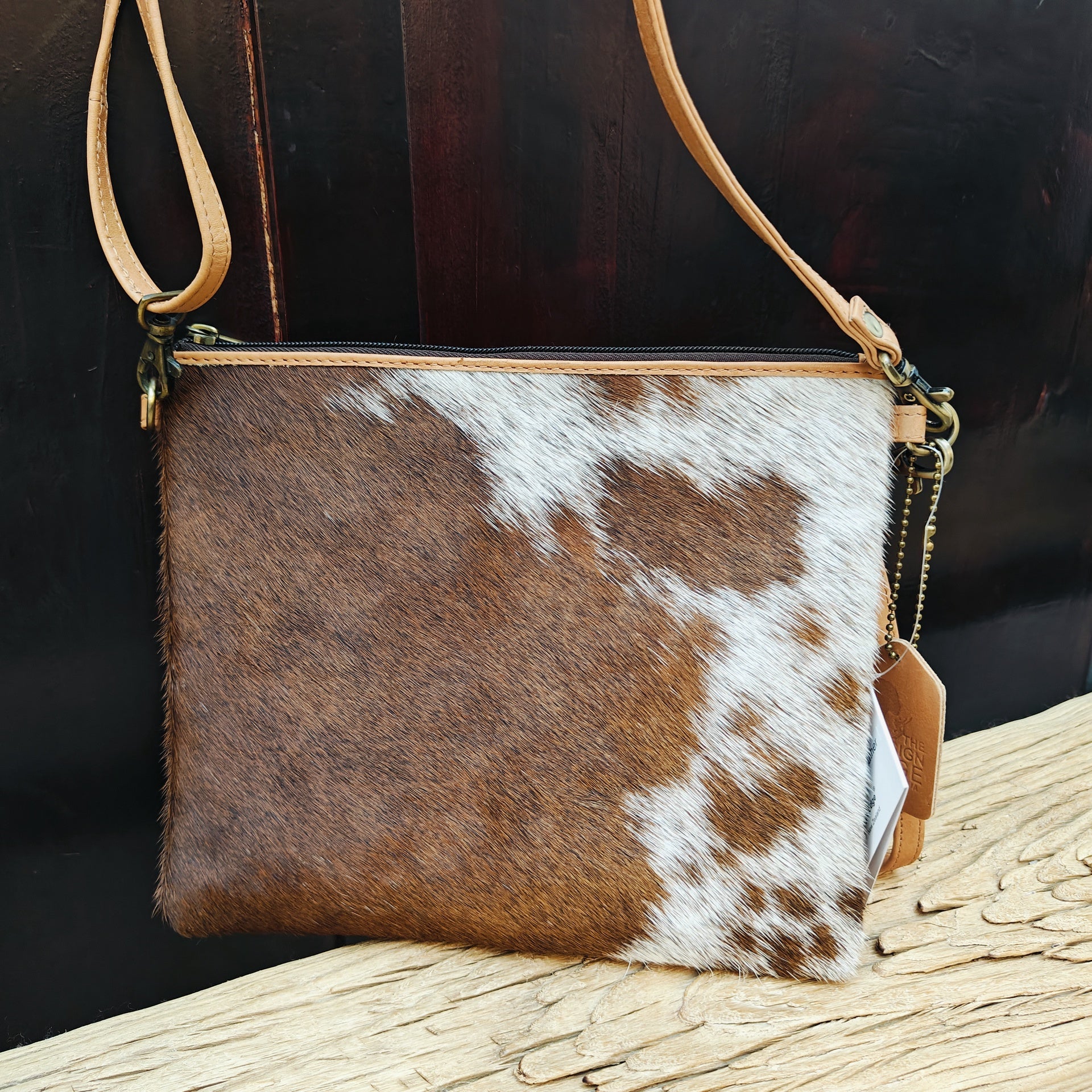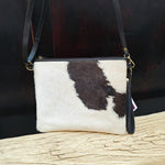 Rectangle bag use as a clutch or over the shoulder - cowhide with front panel hide with hair and smooth leather rear panel. Full width zip closure - with tassel. Inner is lined with cotton lining - with internal small zip pocket and card holder pocket with 3 slots. Comes with shoulder strap with metal clip to adjust length - which is removable.