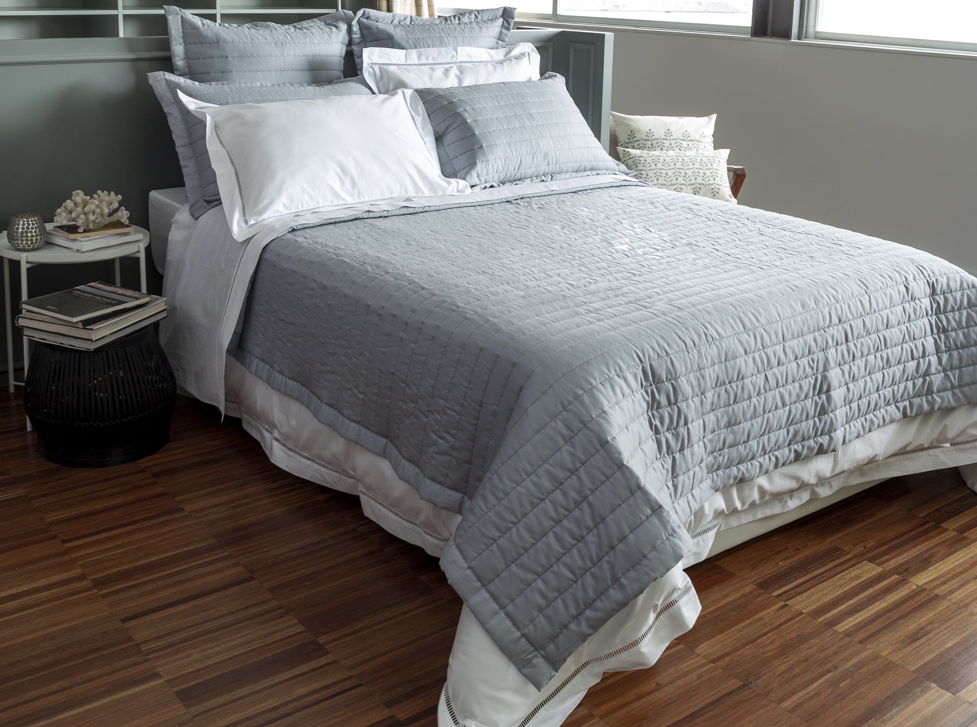 Luxury 100% cotton sateen bedspread with vertical channel quilted design and a bound edge - in a beautiful blue-grey colour. Stunning european quality bed linen.
