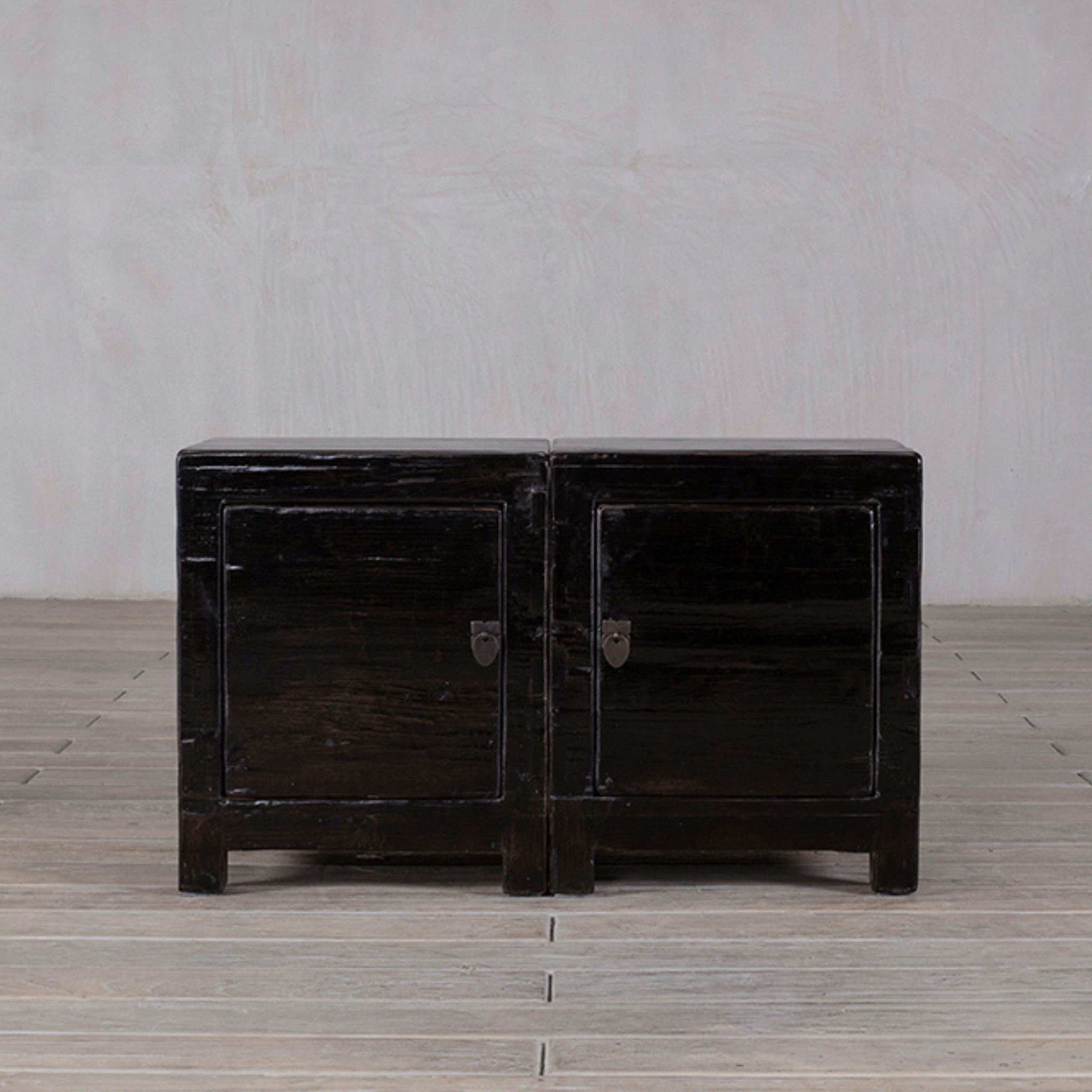 Bedside cabinets - pair available - single cupboard with a door (one left and one right opening). The reclaimed wood is finished with a black lacquer.