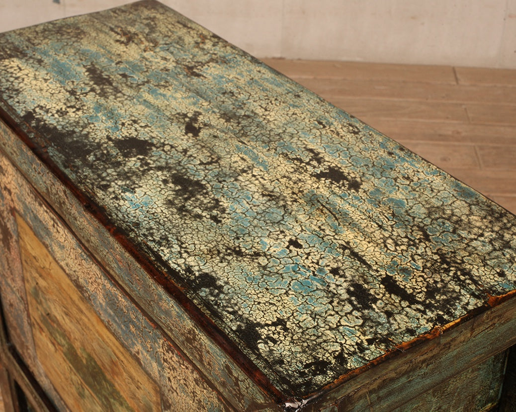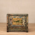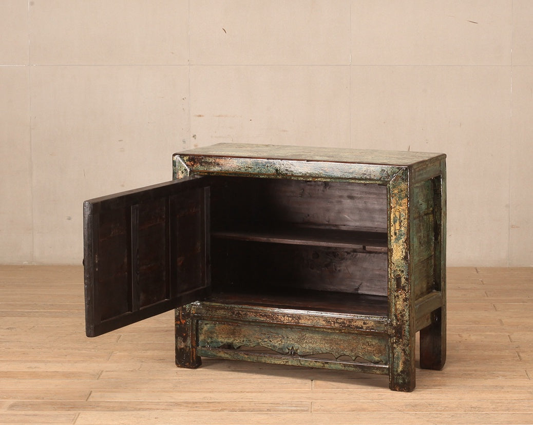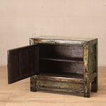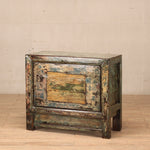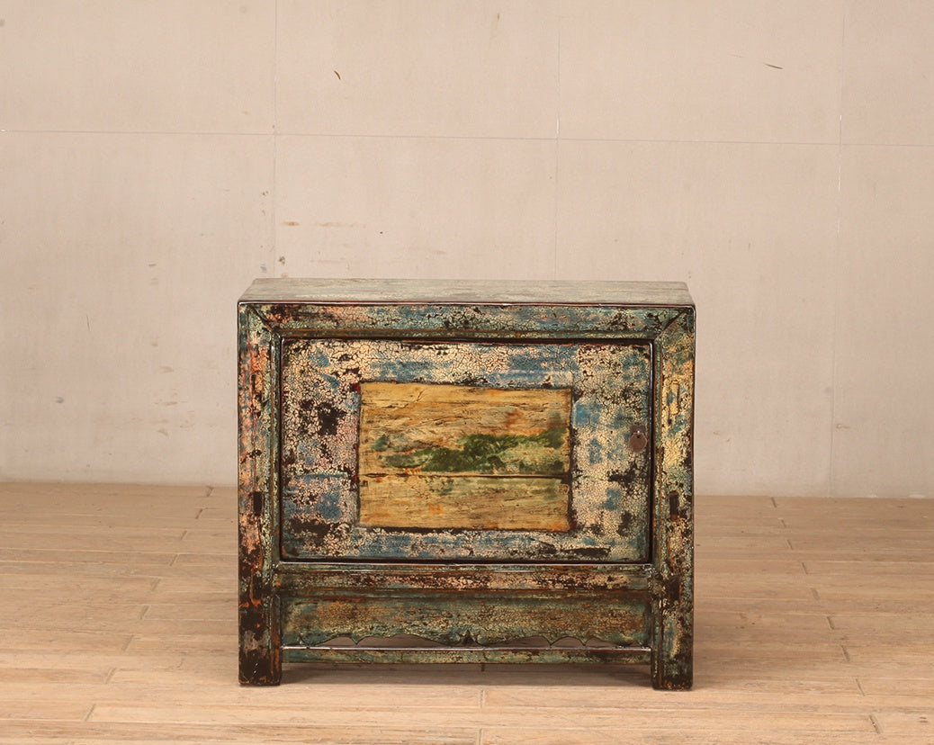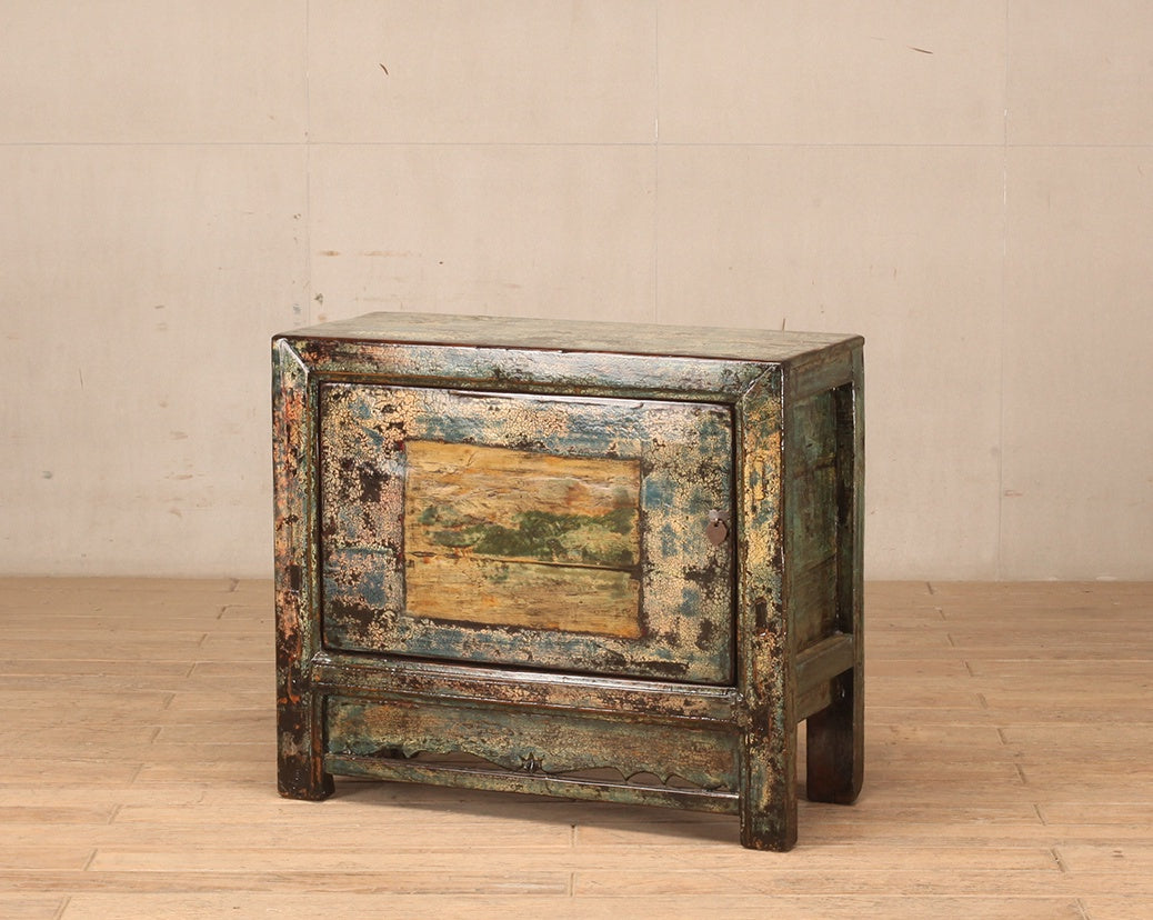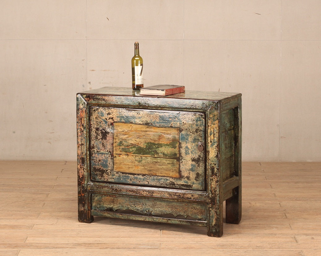 Cabinet - with one door and an internal shelf. Finish is green crackle lacquer with yellow and black undertones. Door includes a feature painting in yellow and green.