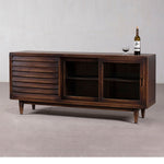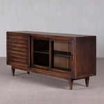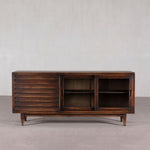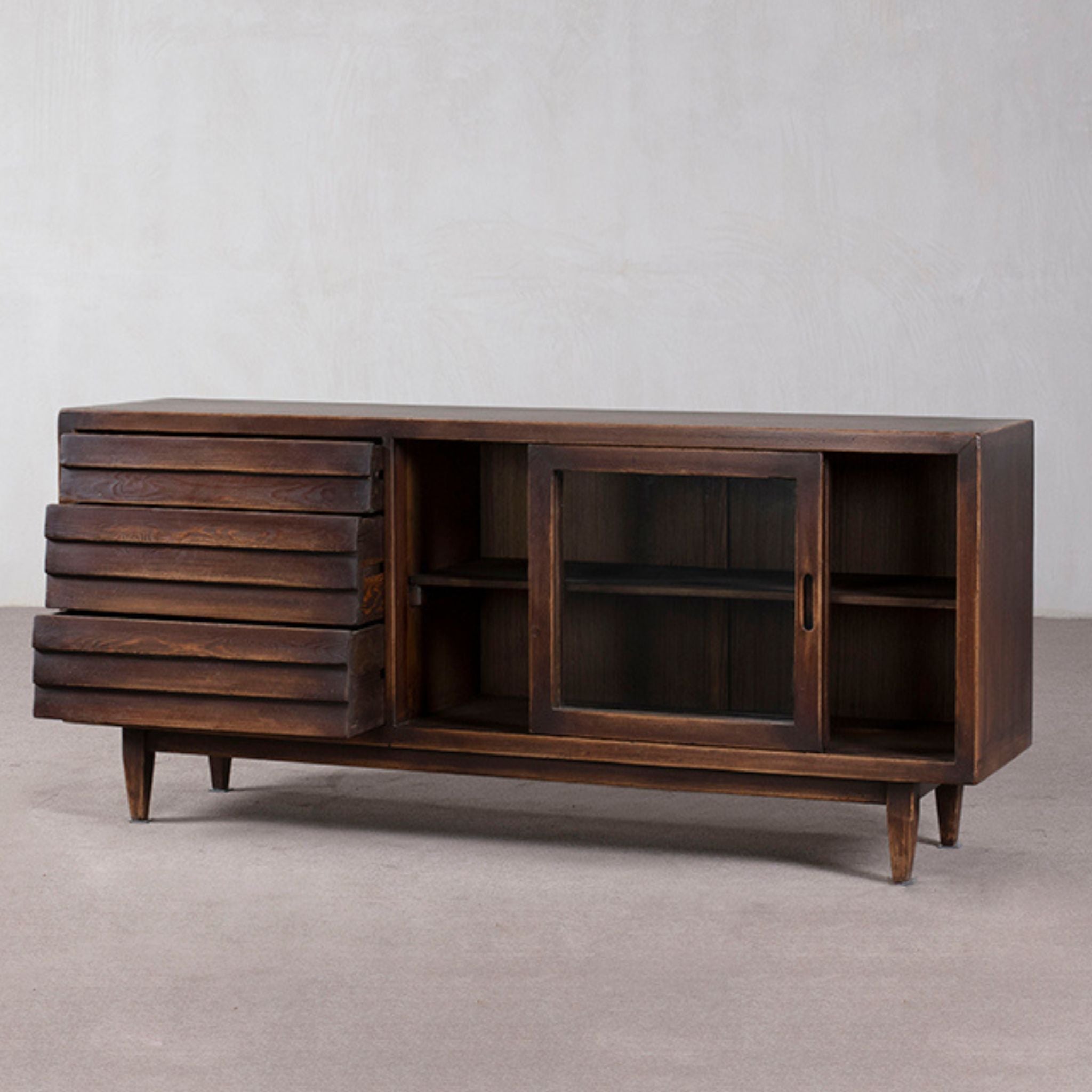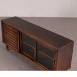 Mid century modern sideboard featuring 3 Drawers - and 2 sliding doors with glass panels. Finished in dark brown - the wood is northern pine. Great storage piece - with display options with the glass fronted doors.