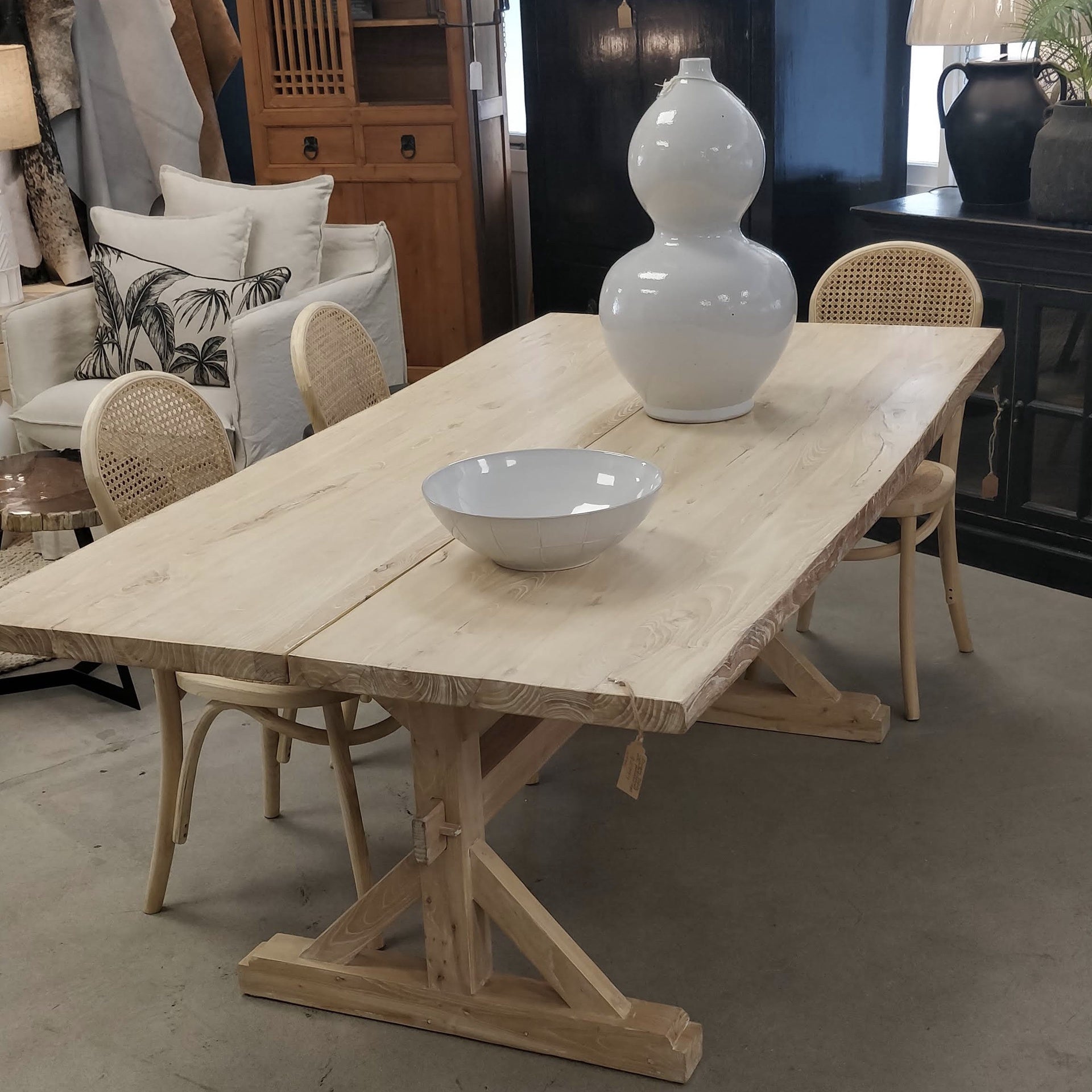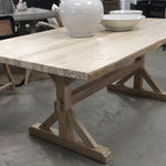 Solid wood table - white washed finish. With pedestal legs at each end. Solid wood construction - made to last. Olio exclusive import.