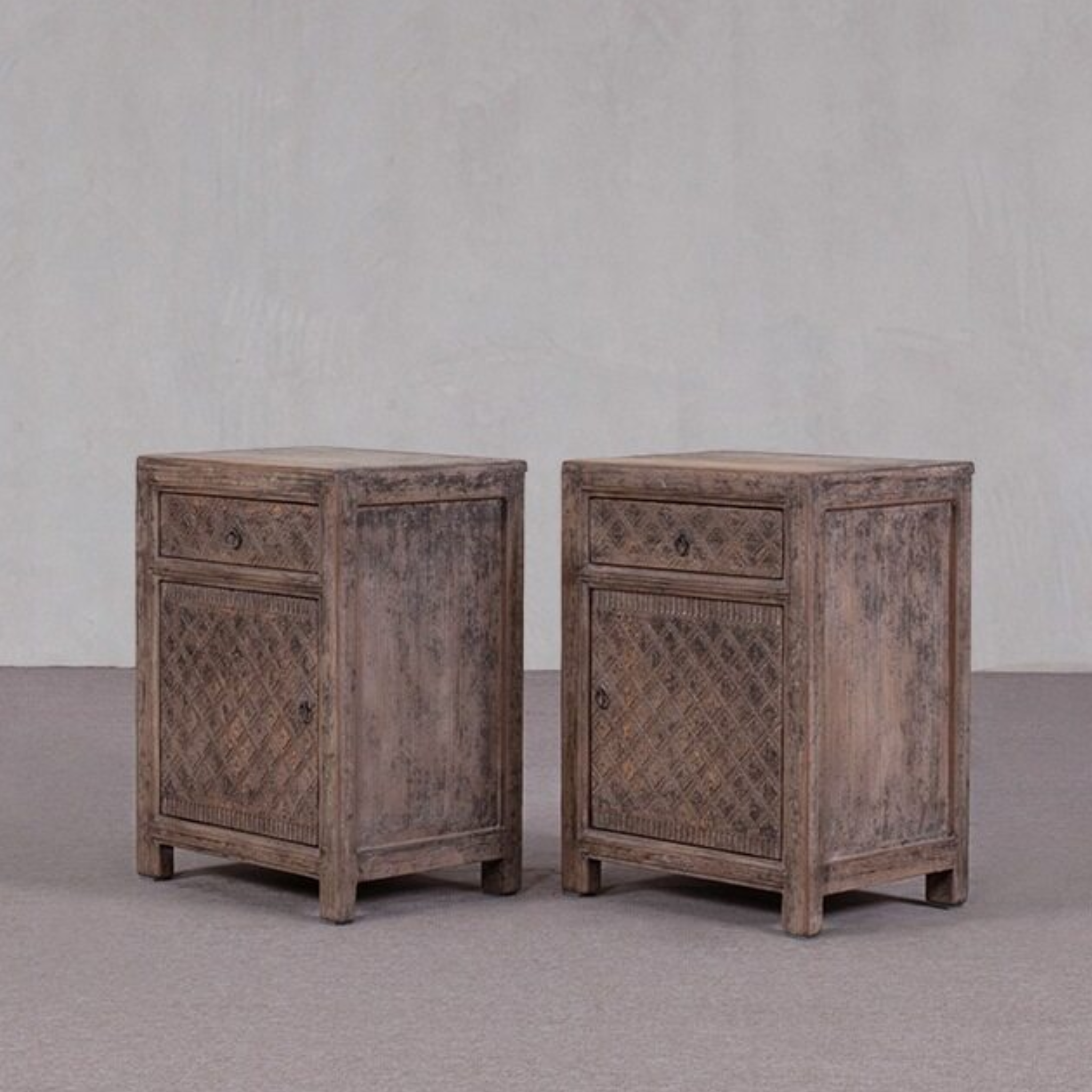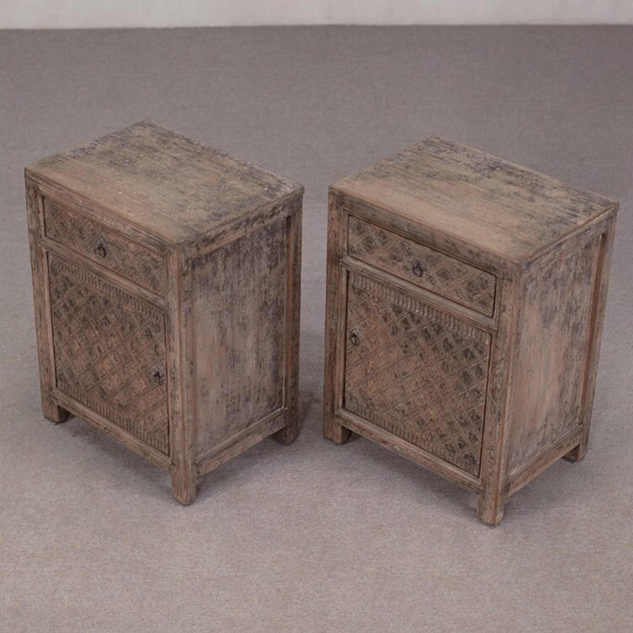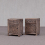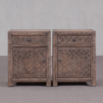Bedside cabinets - pair available - Single drawer and cupboard with a door (one left and one right opening). The reclaimed pine wood is finished with a dry grind finish - and is embellished with a carved patterned detail.