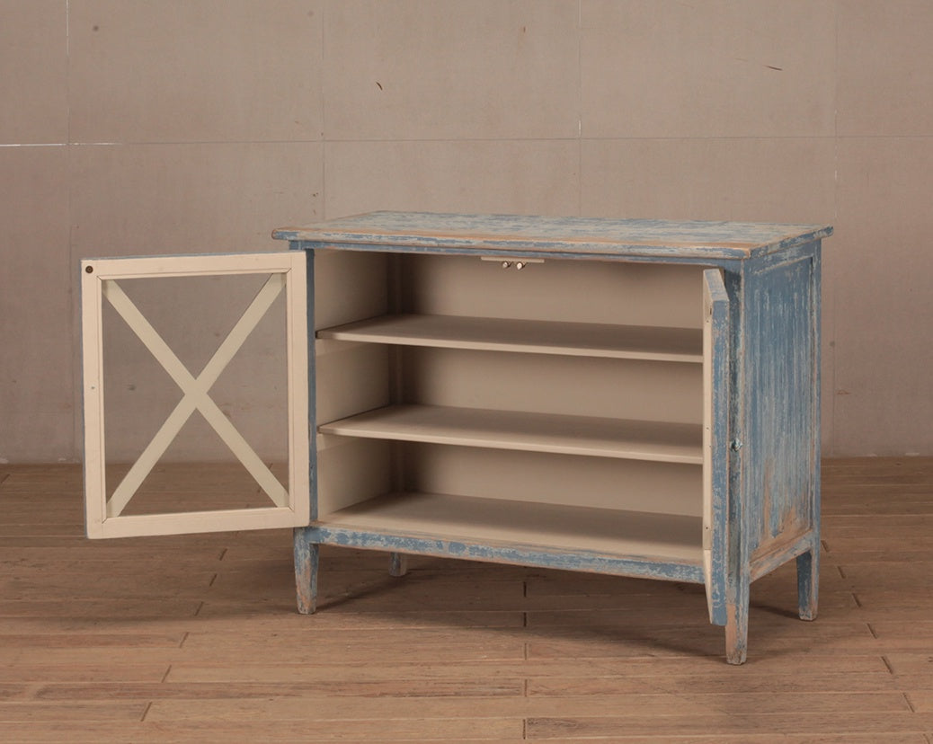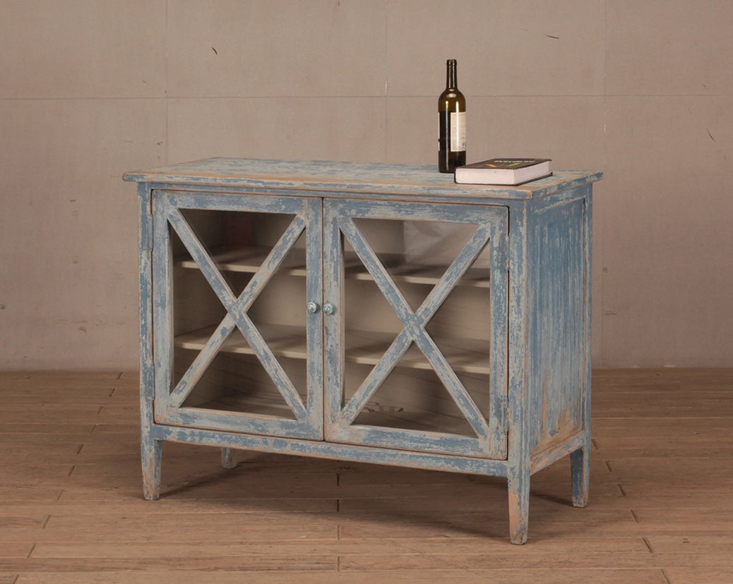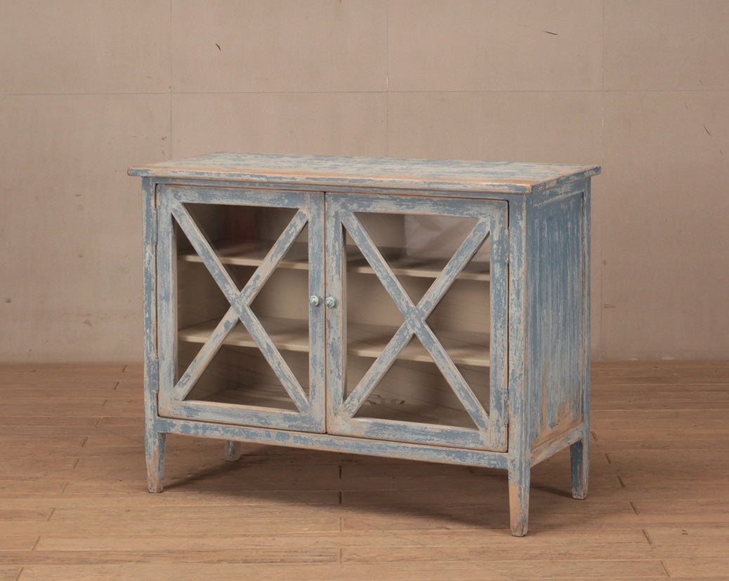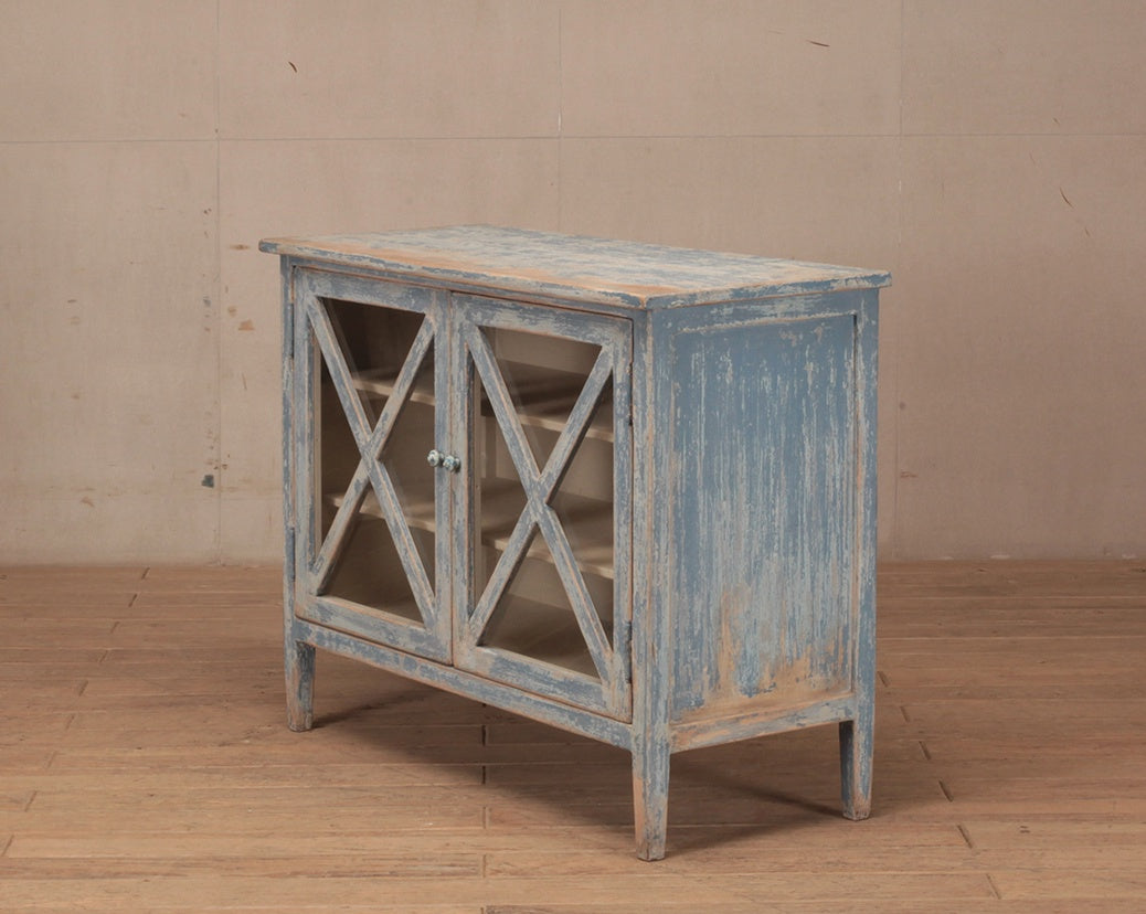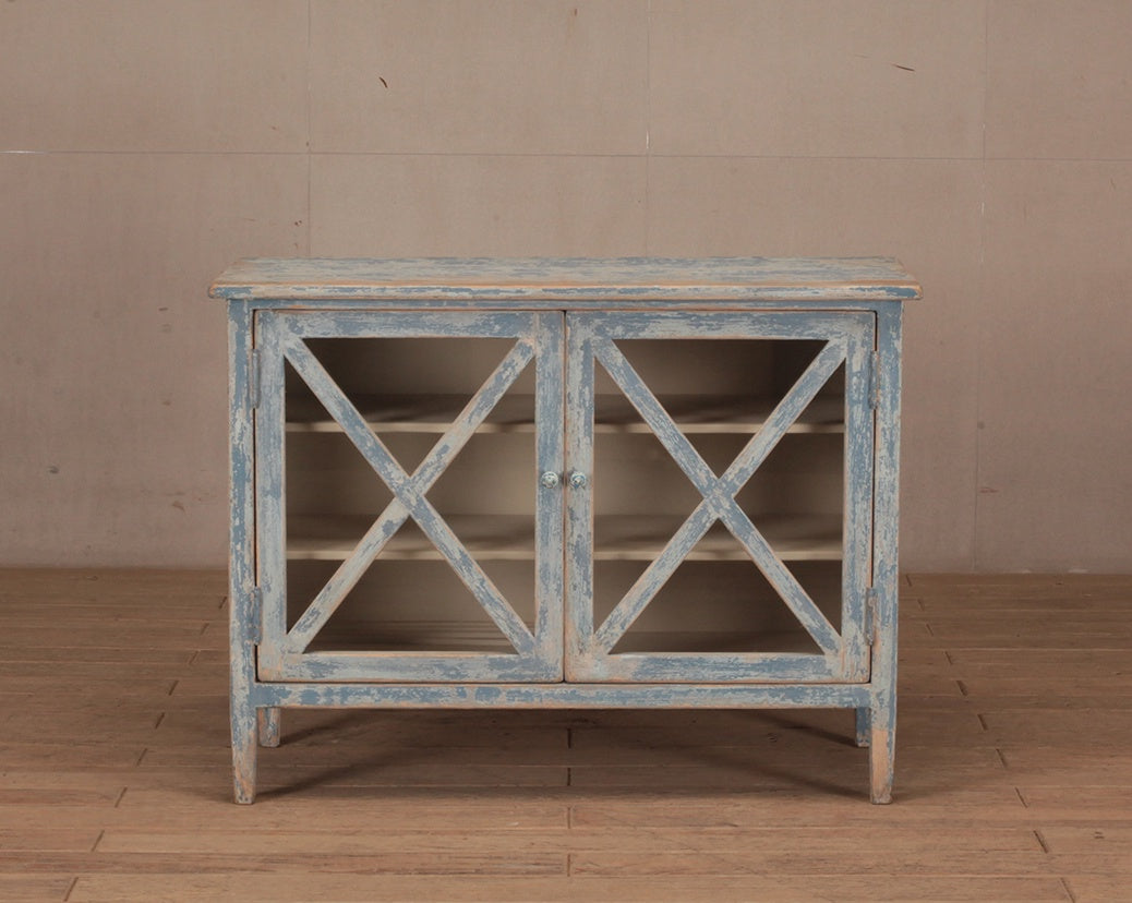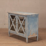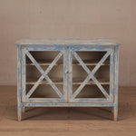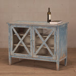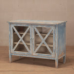 Cabinet with 2 Doors - finished in a blue wash with the natural wood showing through. Doors have a cross detail and glass. This piece is newly made from recycled wood.