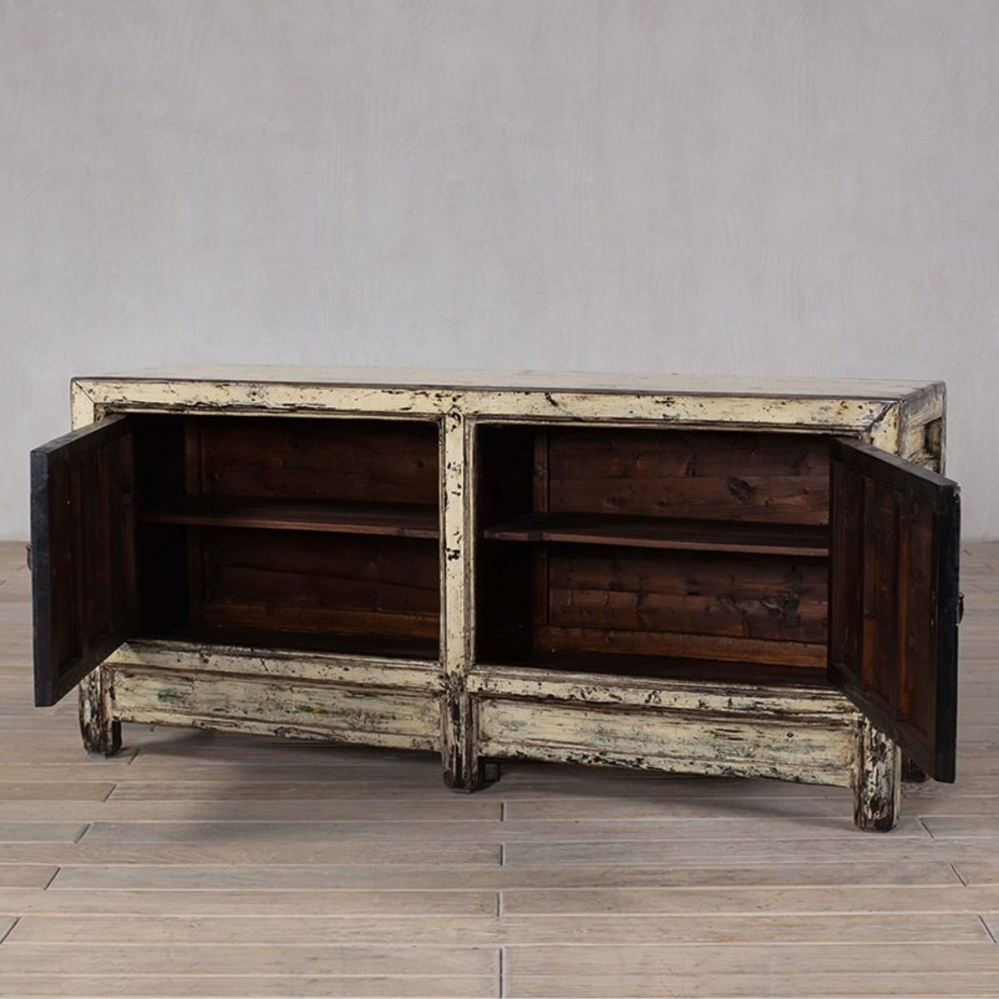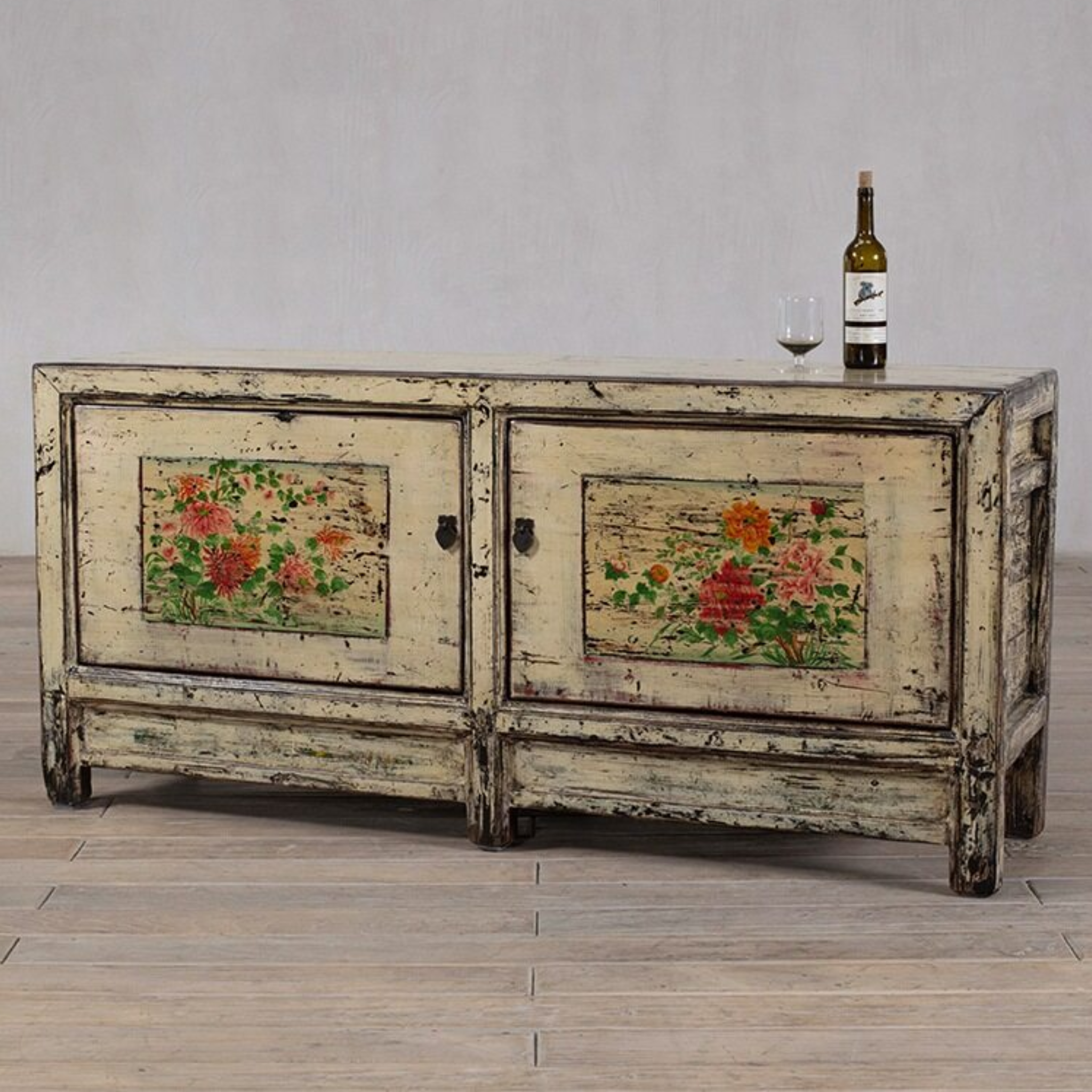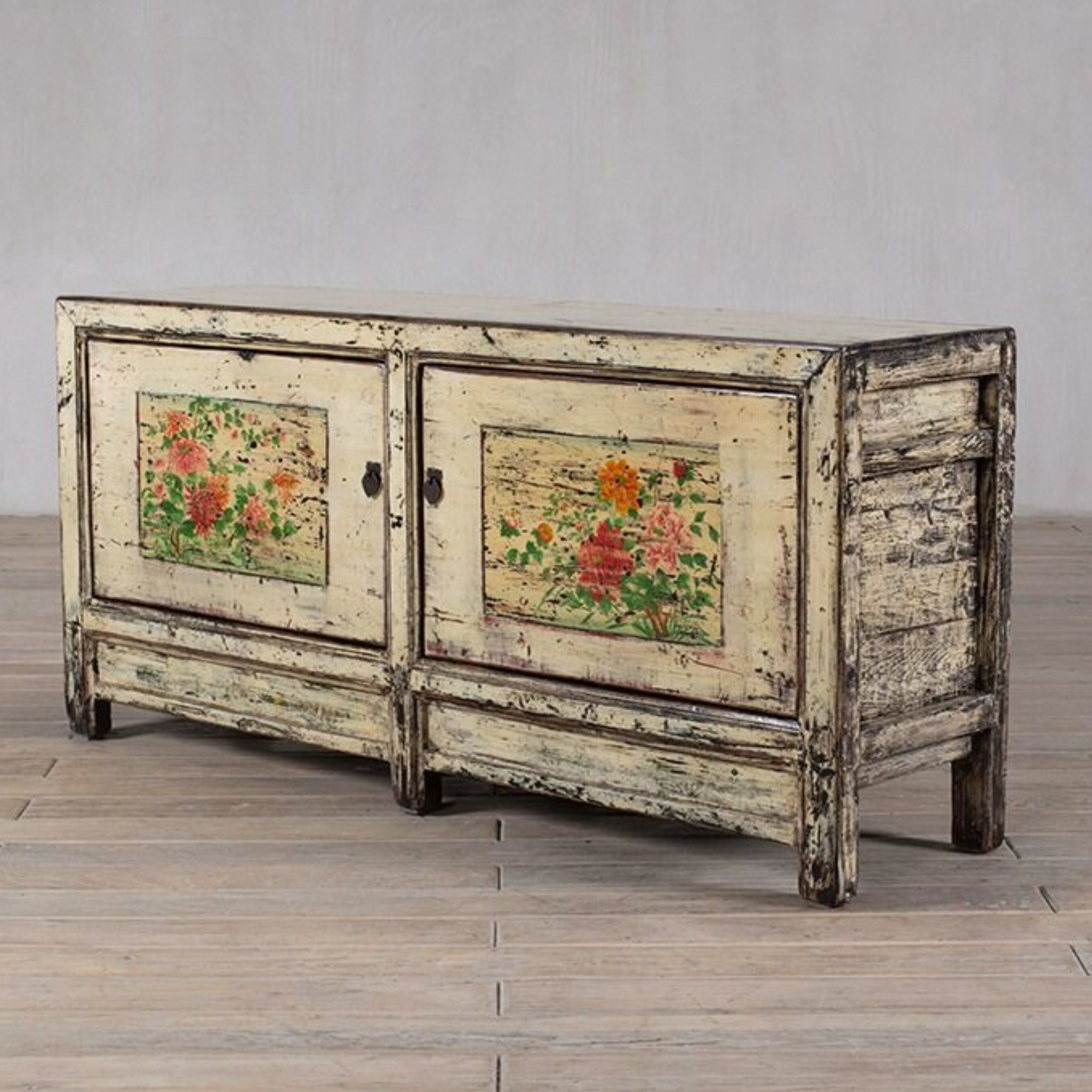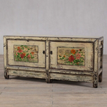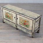 c1900 cabinet or sideboard - finished in creamy white lacquer with 2 doors. The cabinet features the original floral paintings. Made from elm.