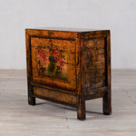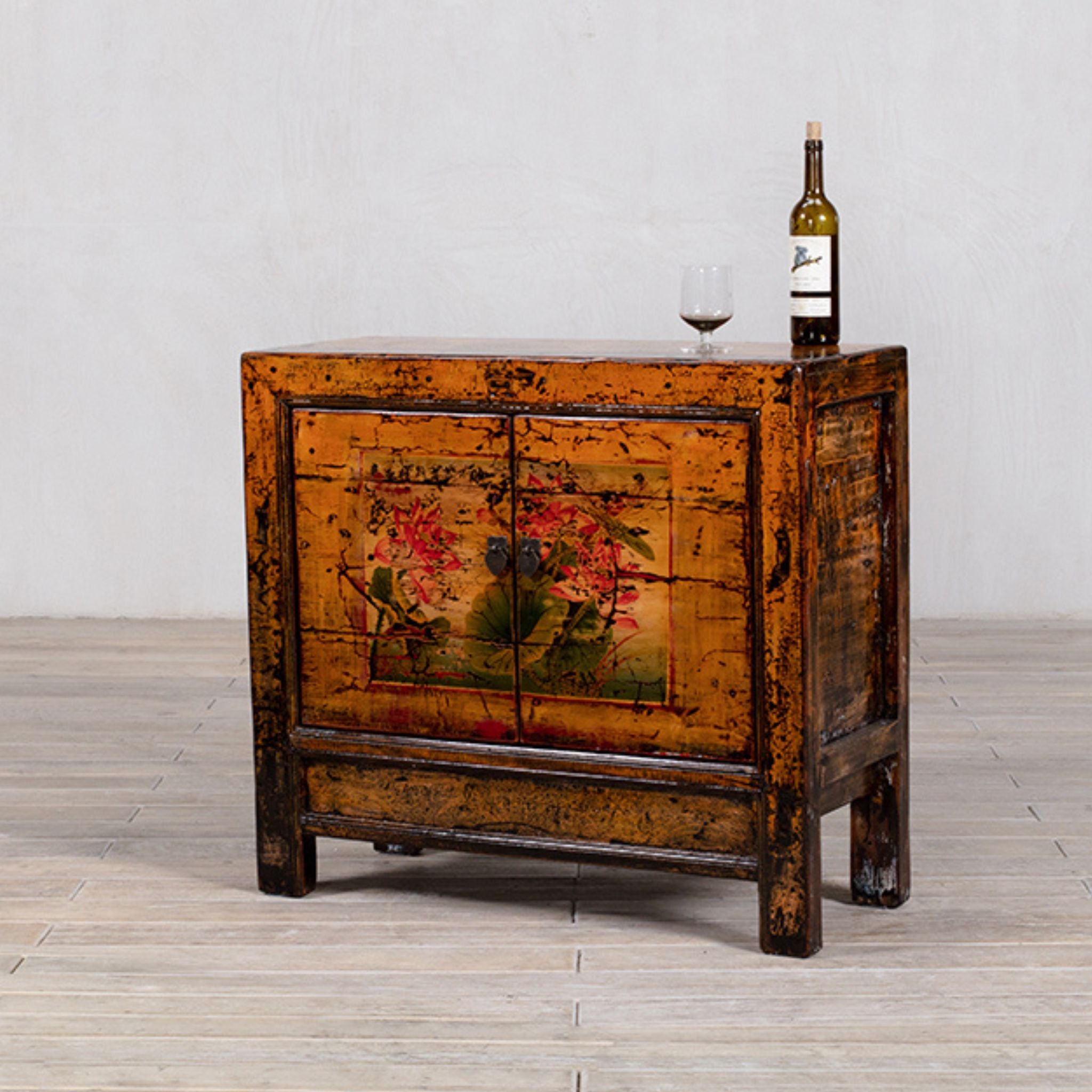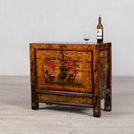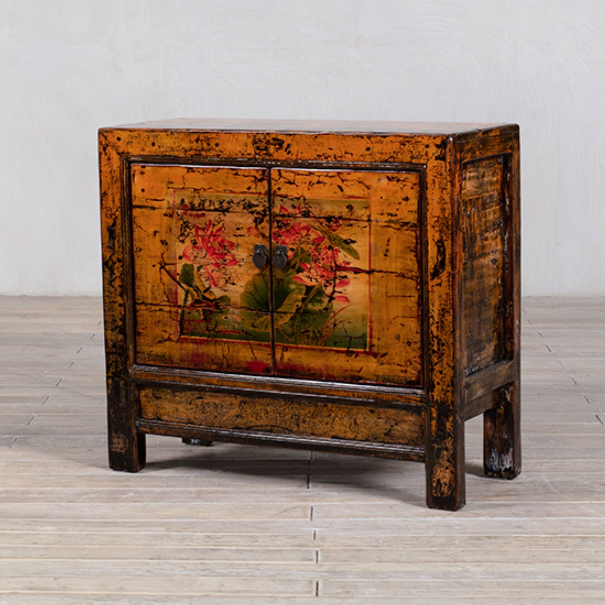 c1920s - cabinet with two doors - finished in a beautiful burnt orange lacquer with black undertones. The door panels feature the painted detail from the original cabinet.
