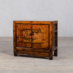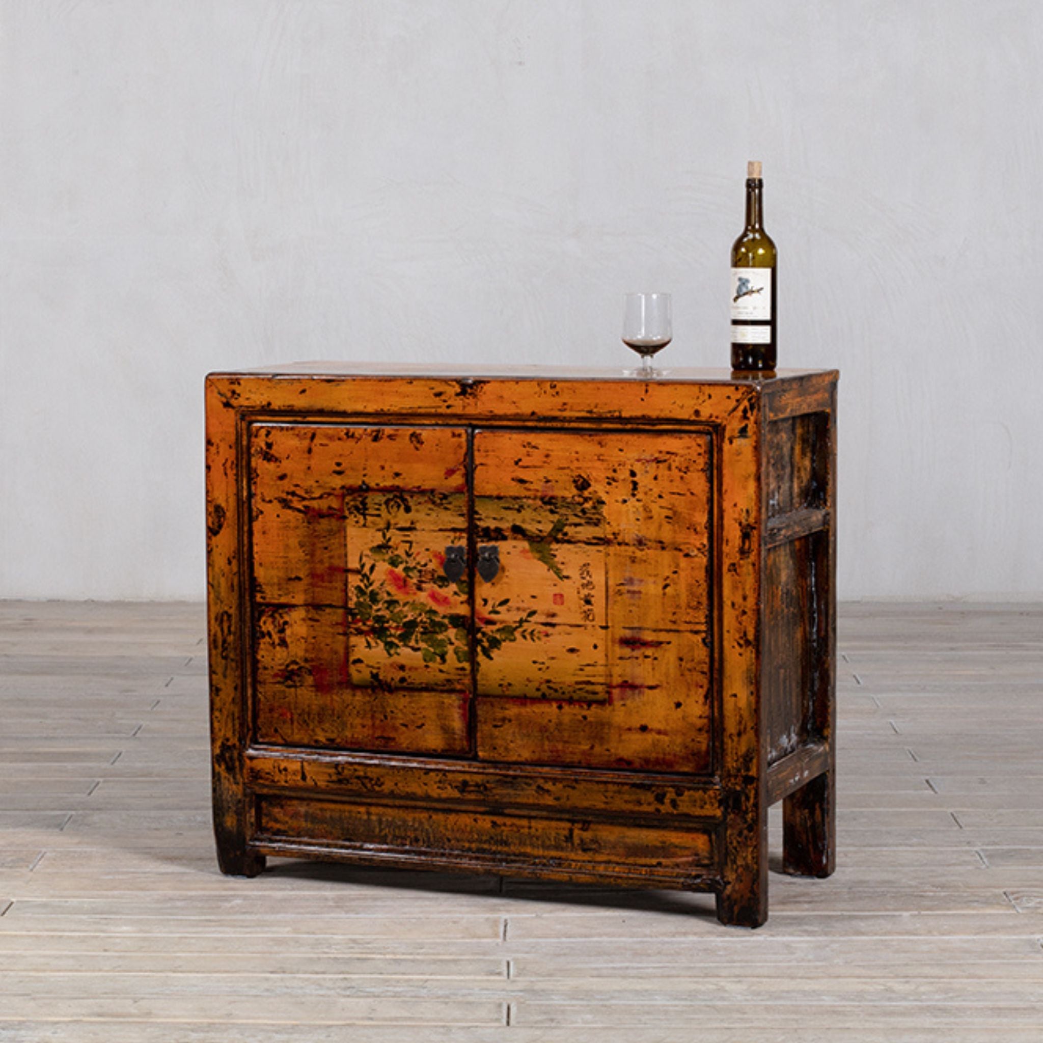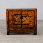 c1920s - cabinet with two doors - finished in a beautiful burnt orange lacquer with black undertones. The door panels feature the original painting that would have adorned the cabinet in its unrestored condition.