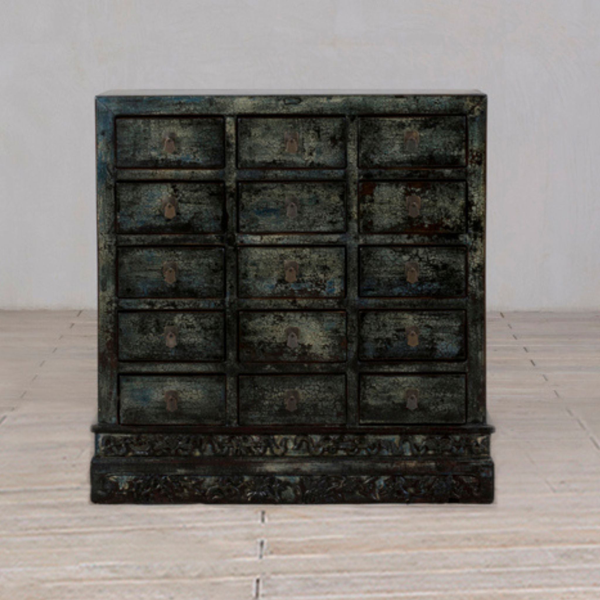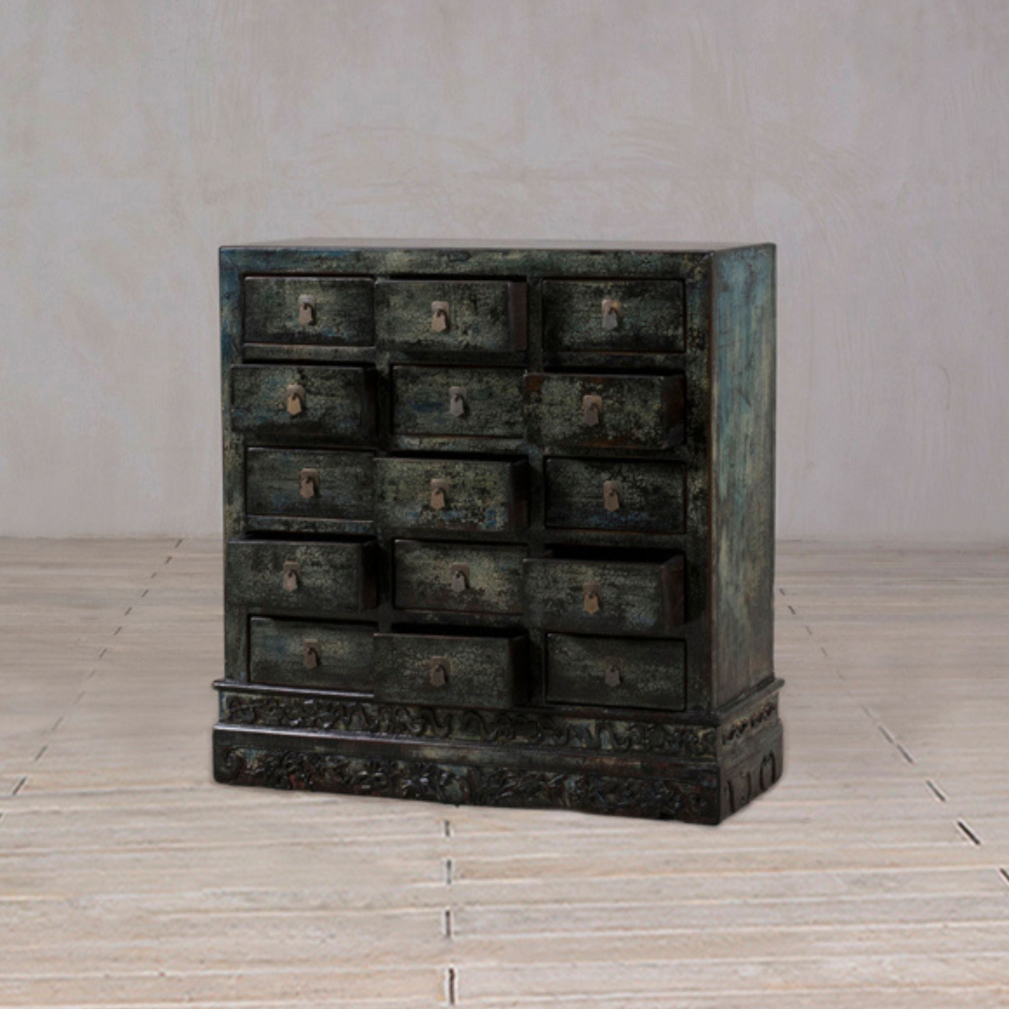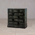 c1920s - traditional style apothecary cabinet - with 15 drawers. This piece is finished in a beautiful dark green lacquer - with the black and yellow undertones.