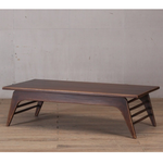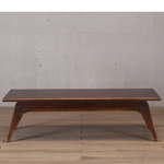 Coffee table - angled legs with rail detail. Style is reminiscent of mid-century modern The finish is a brown stain with a rubbed detail. Solid reclaimed (northern) pine.
