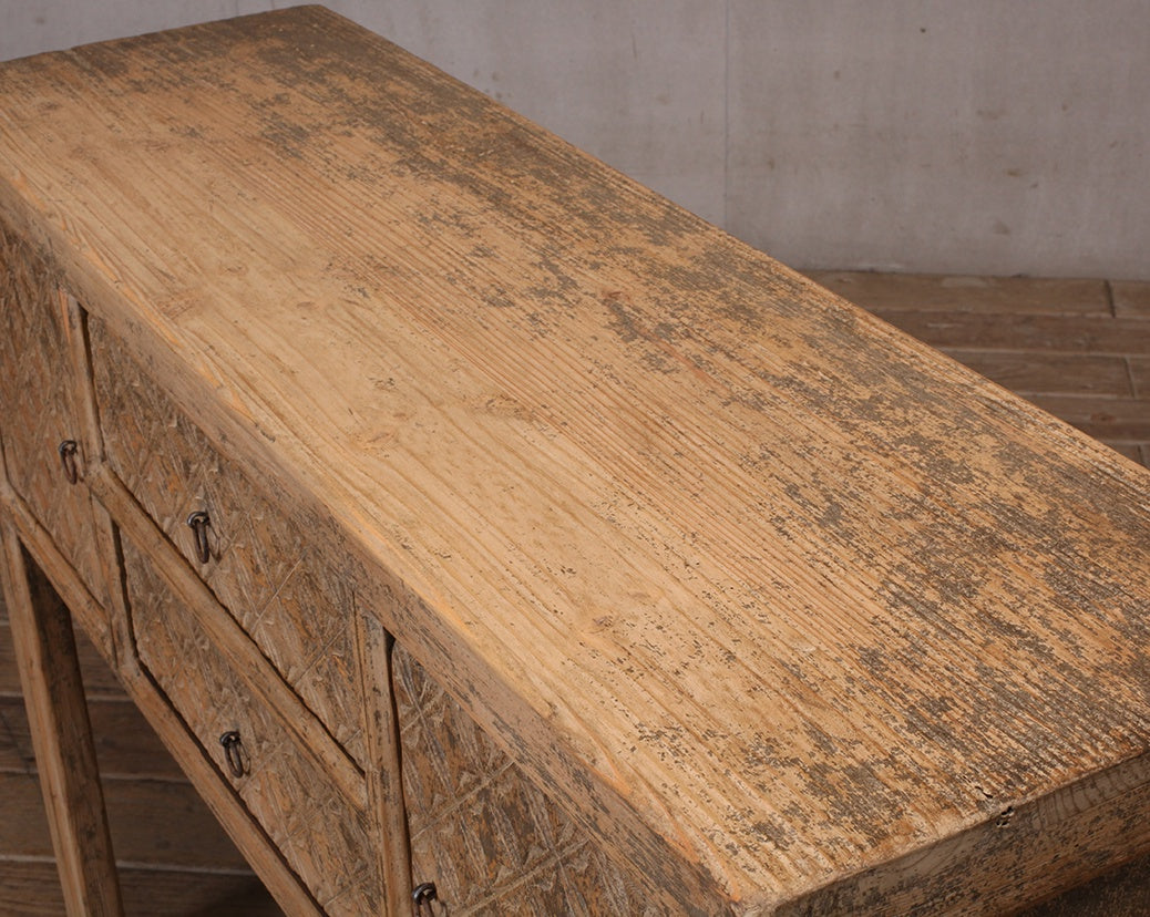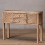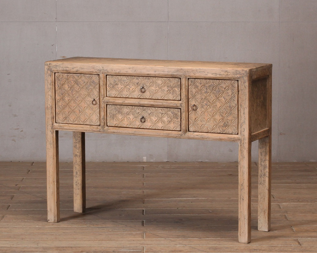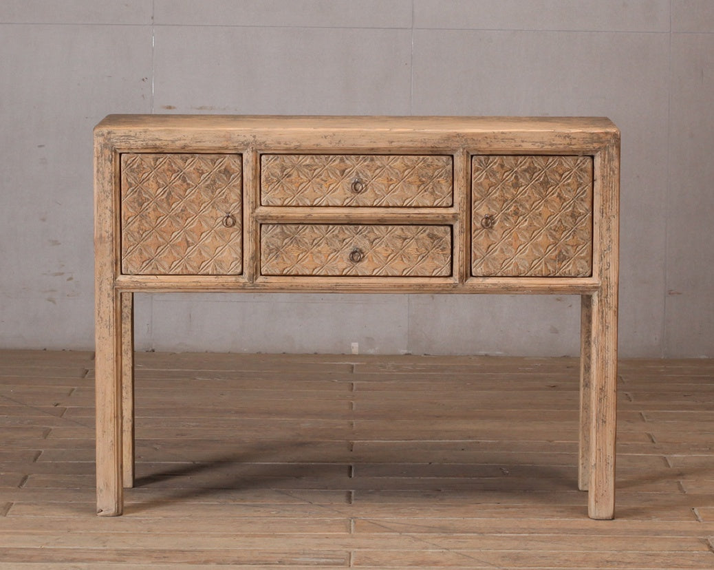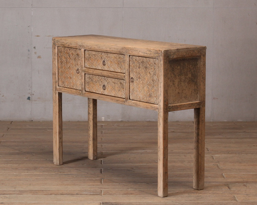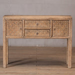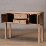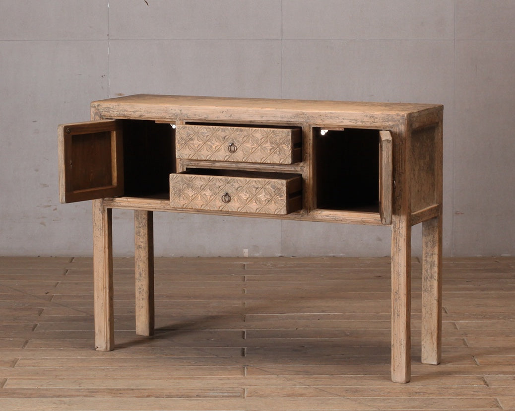 Console table - two drawers and two doors. Beautiful carved detail - on drawer and doors - finish is dry grind showcasing and enhancing the natural wood.