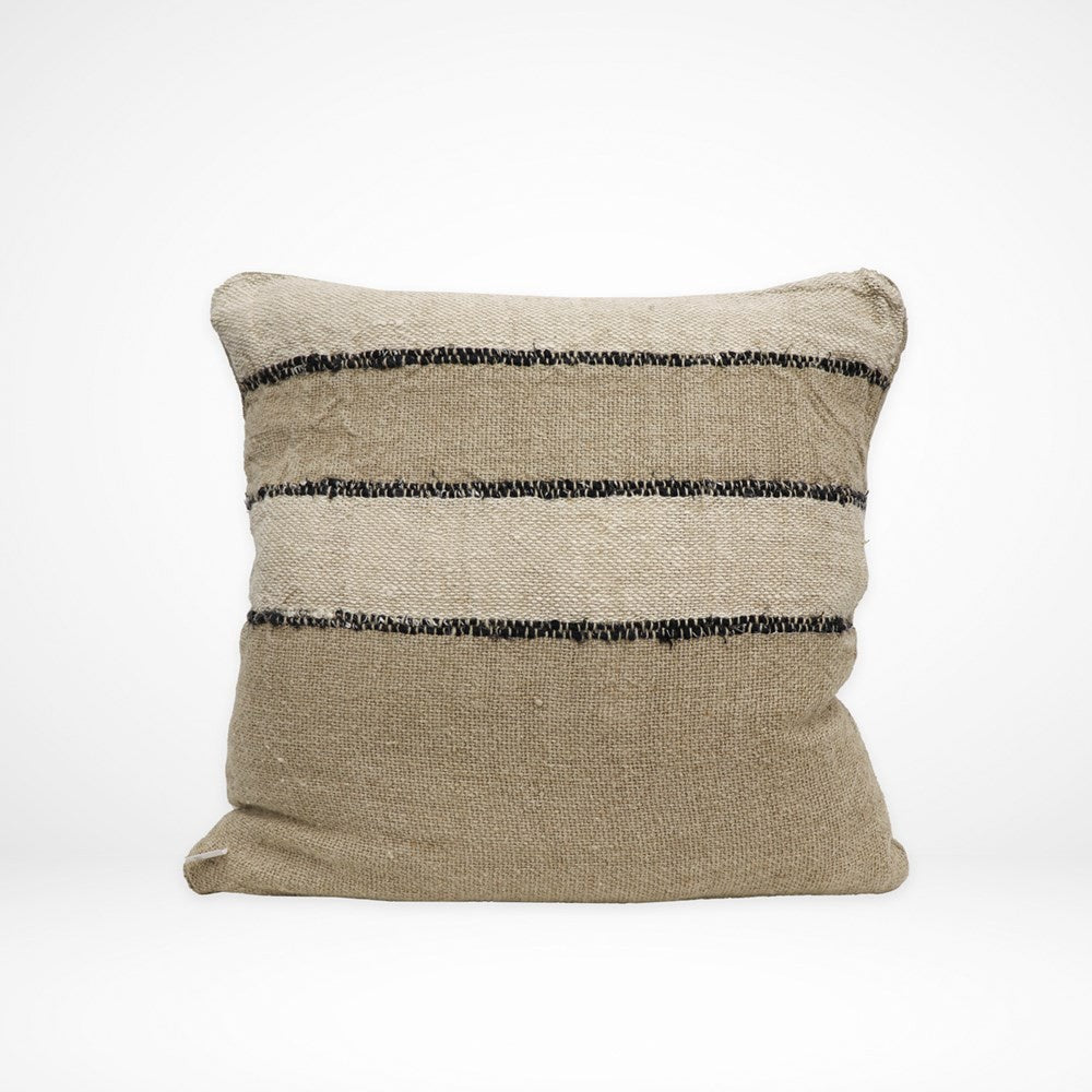 Gorgeous linen scatter cushion - in linen both front and back. Loose weave stripes in stone, black and cream on front - gives texture and personality to your space - back is tighter weave in plain colour. Comes complete with feather inner.