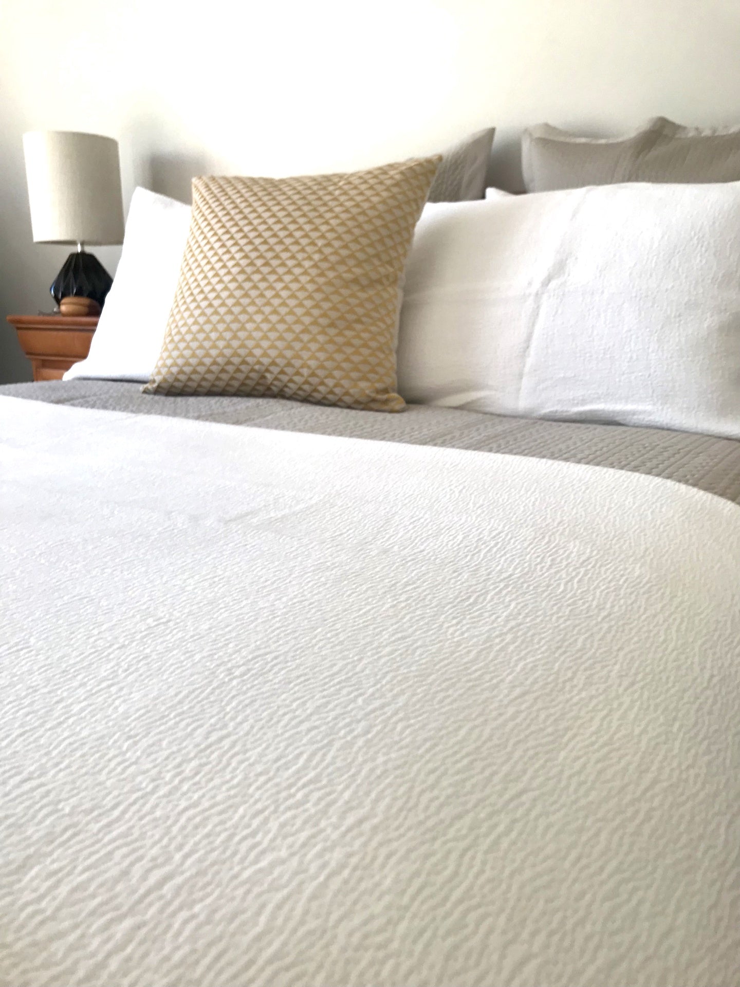 Luxury 100% cotton stone wash bedspread with stitched design - set with cover and two pillowcases (50 x 75 cm) - in a white. Stunning european quality bed linen.