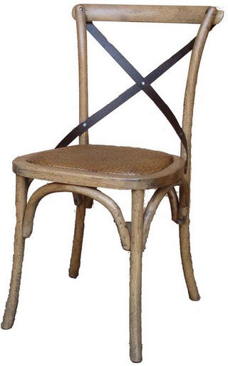 Traditional style cross back dining chair. Oak frame with metal cross back - and padded rattan seat.