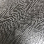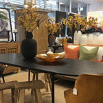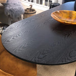 Elegant contemporary dining table with a solid ash top finished in black with black steel legs .