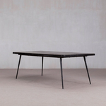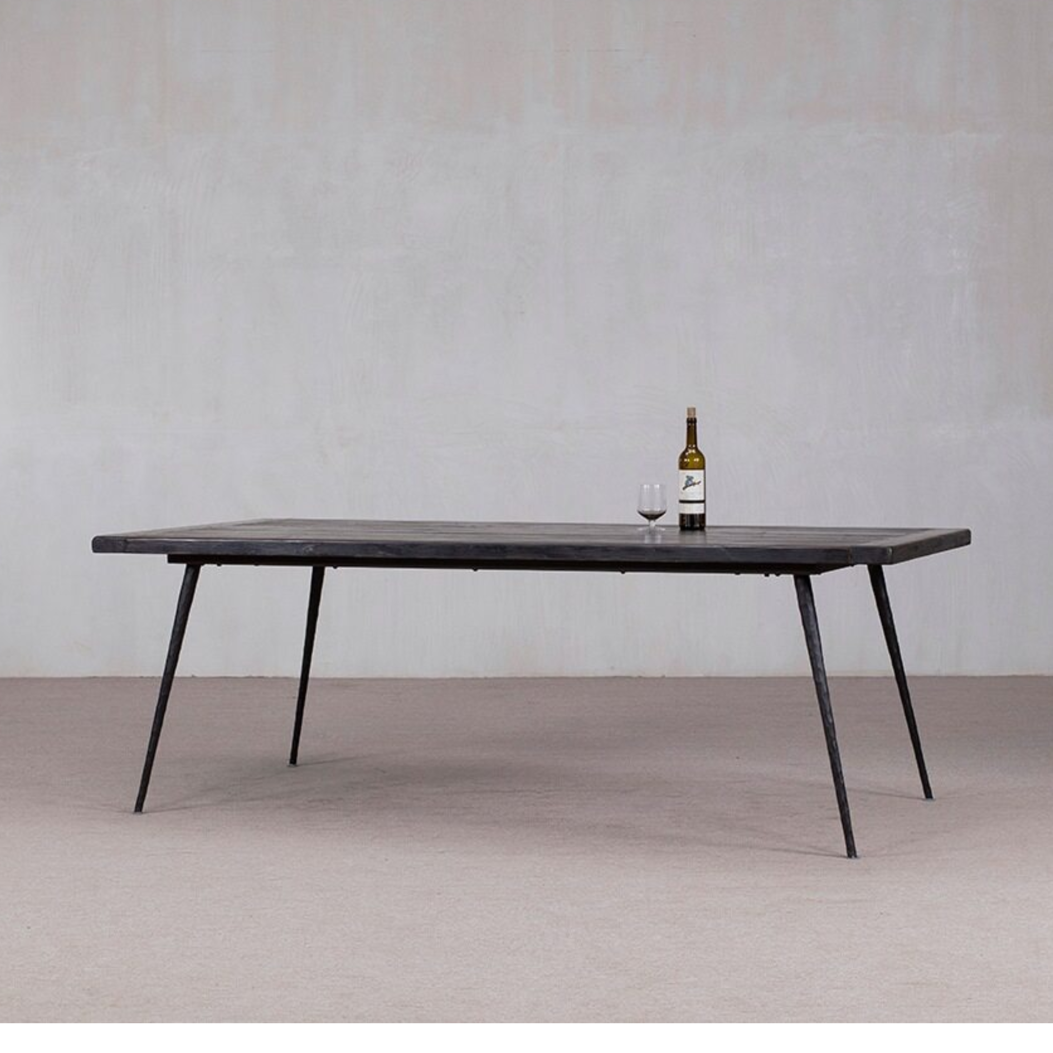 Dining Table - the top is made from pine - with a dark stain - rustic in style. The legs are made from metal and are slightly angled.