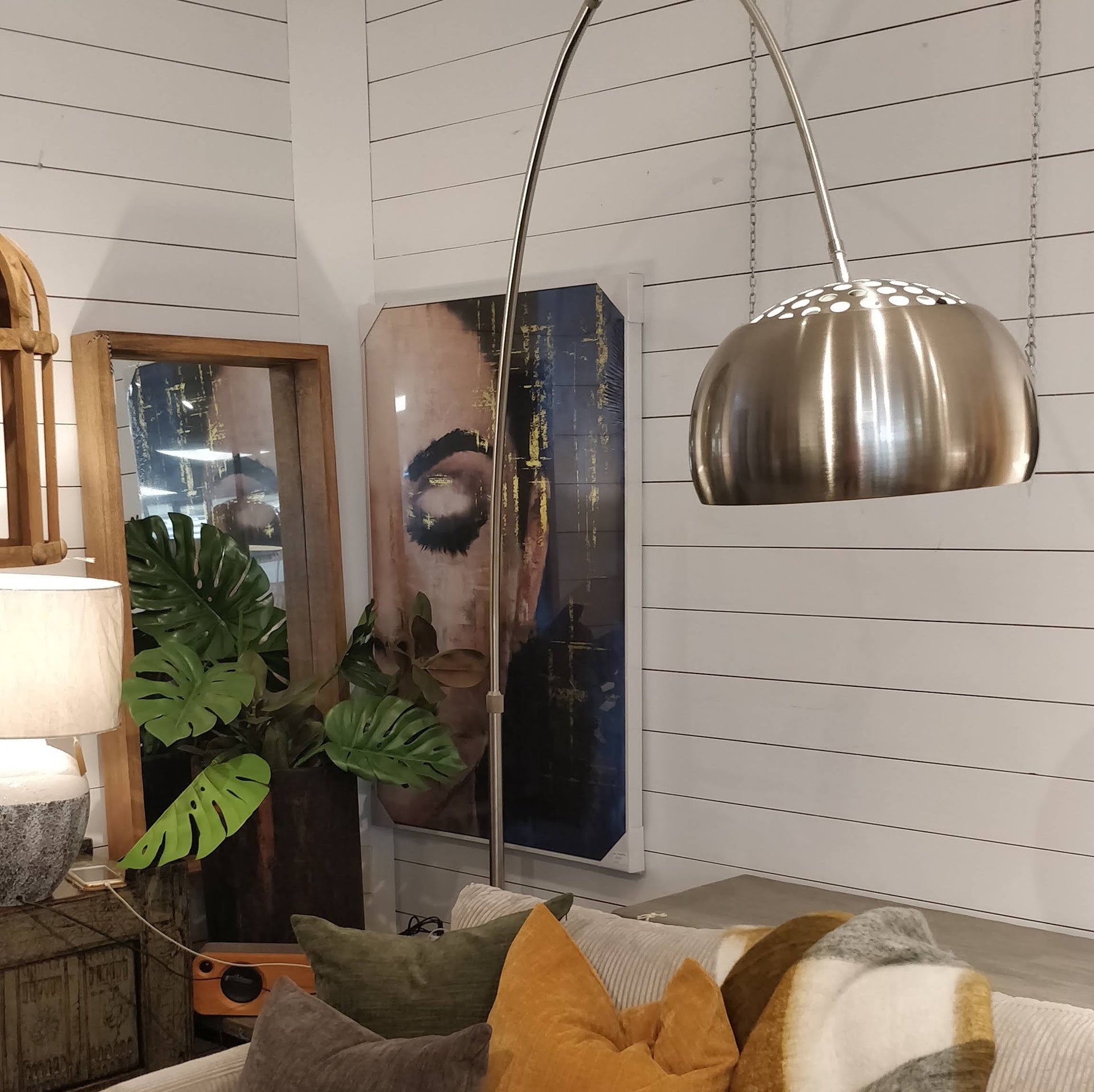 Floor lamp - with arched stainless steel and solid marble base. Width is adjustable. LED bulb has two settings - cool or warm light.