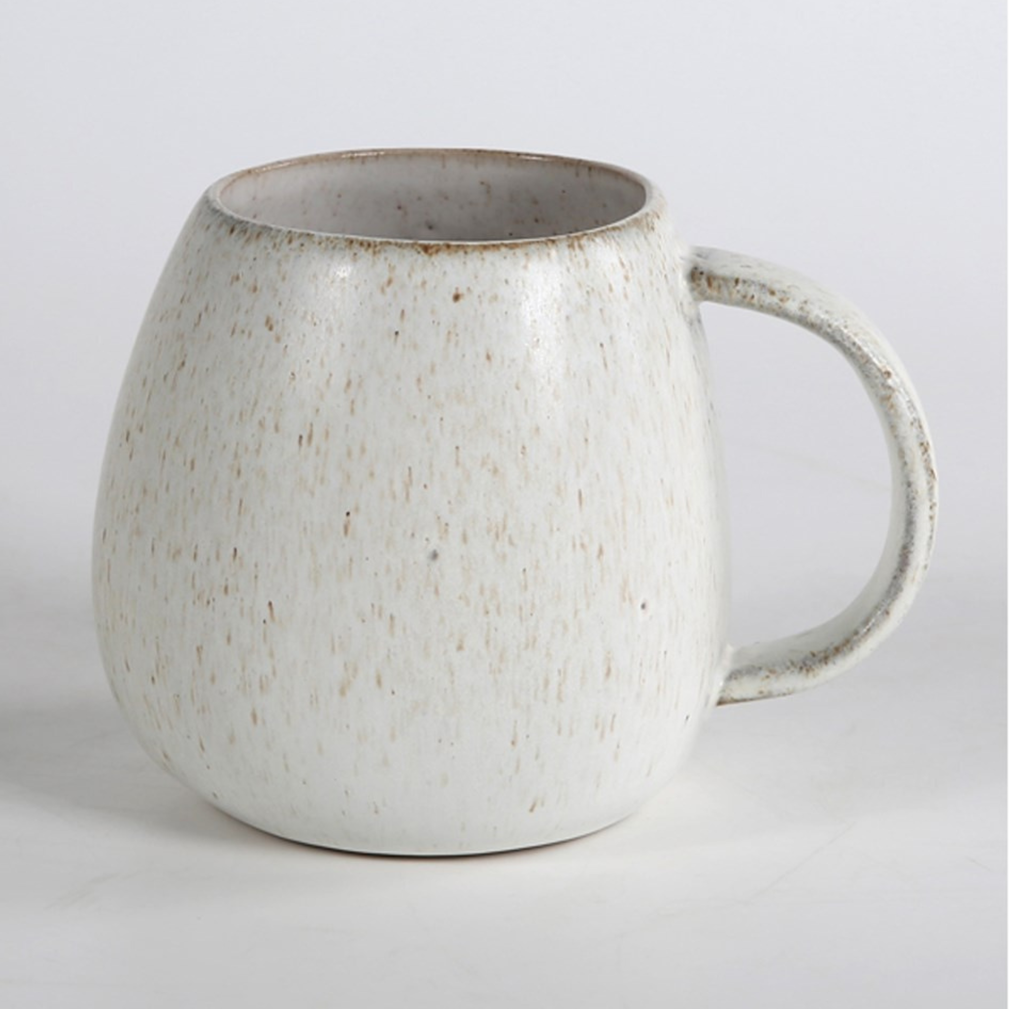 The Fort Mug - is an oversized mug - made from a mottled white ceramic. The shape including the handle are curved and organic.