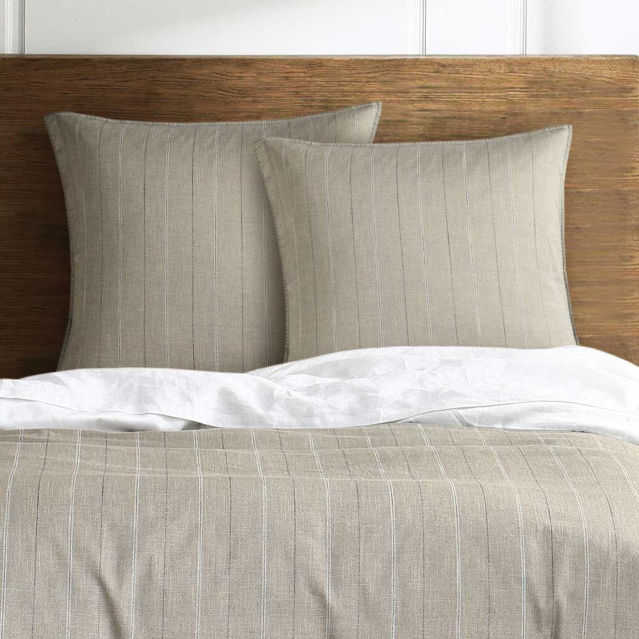 A timeless stripe design crisp in style - yet softened by two neutral colour ways. Each set comes with 2 euro covers 65 x 65 cm - in a quality 300 thread count pure cotton sateen. There is a matching duvet cover set available or mix and match with the Laundered Linen range.