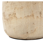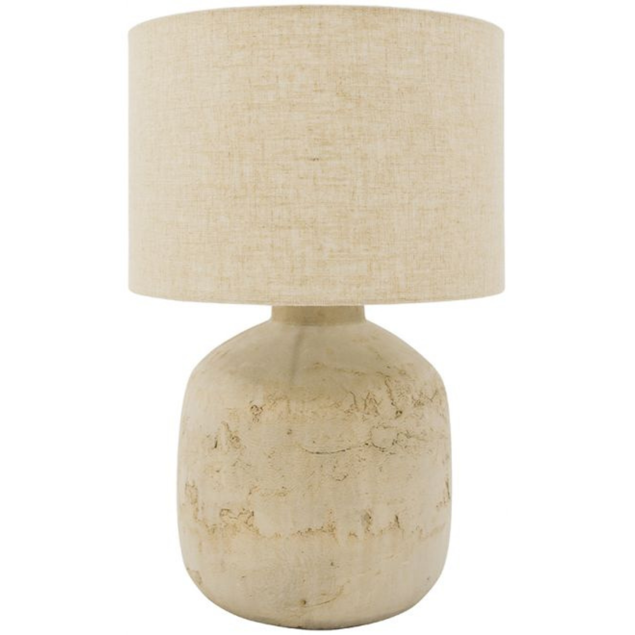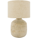 Table lamp with textured ceramic base in off white and neutral beige tones - with an off white linen shade.
