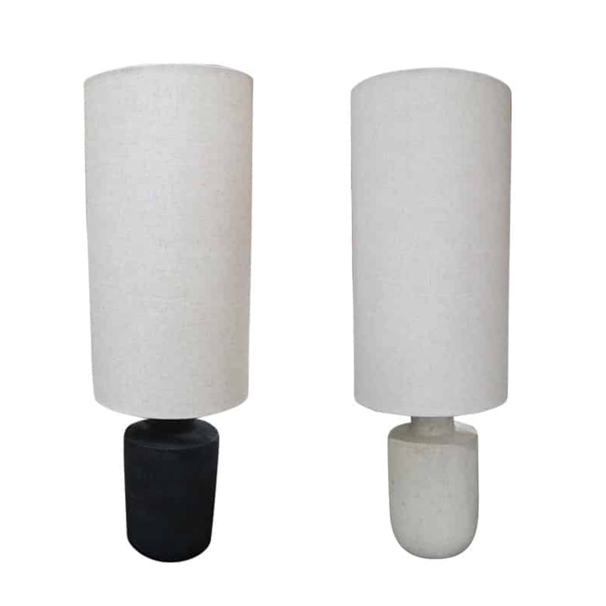 Table lamp with ceramic base matched with oversize tall linen shade. Available in a black and stone base.