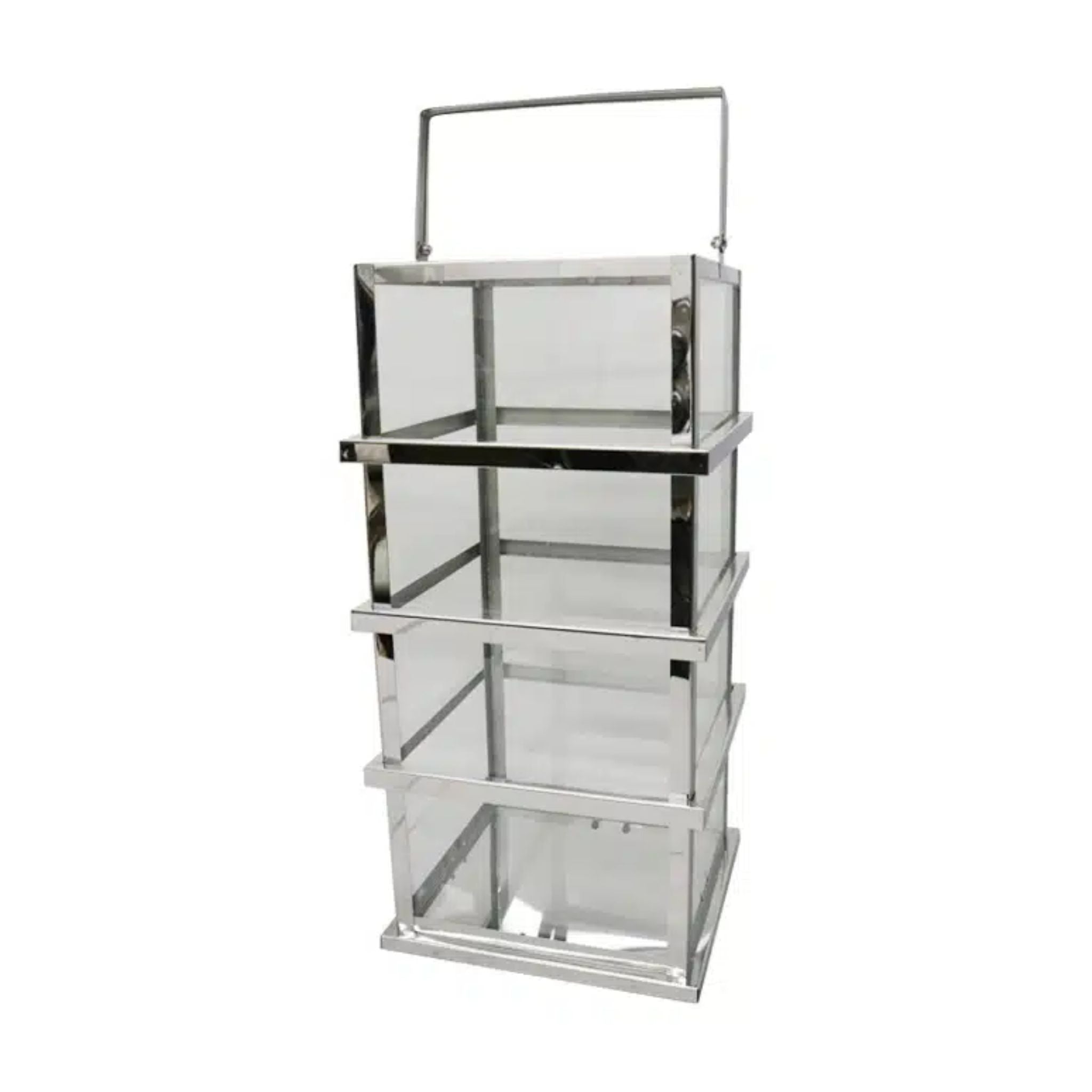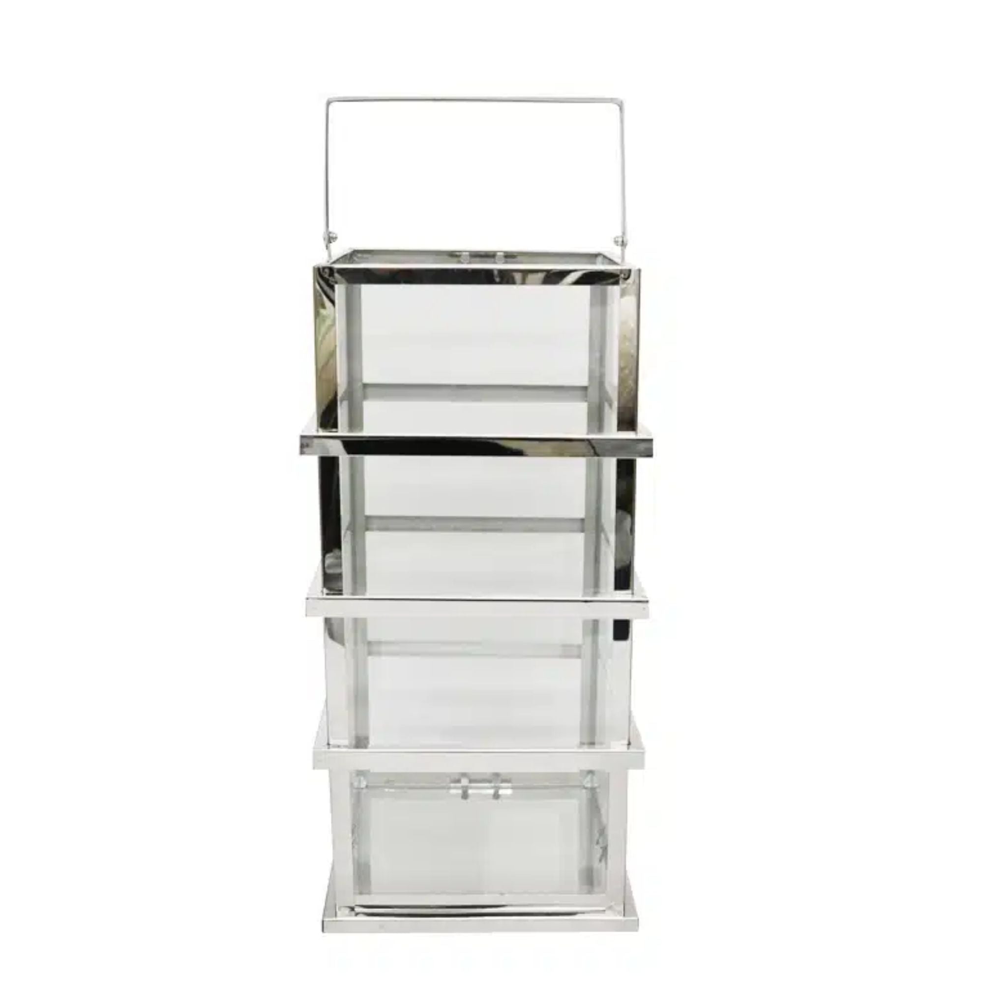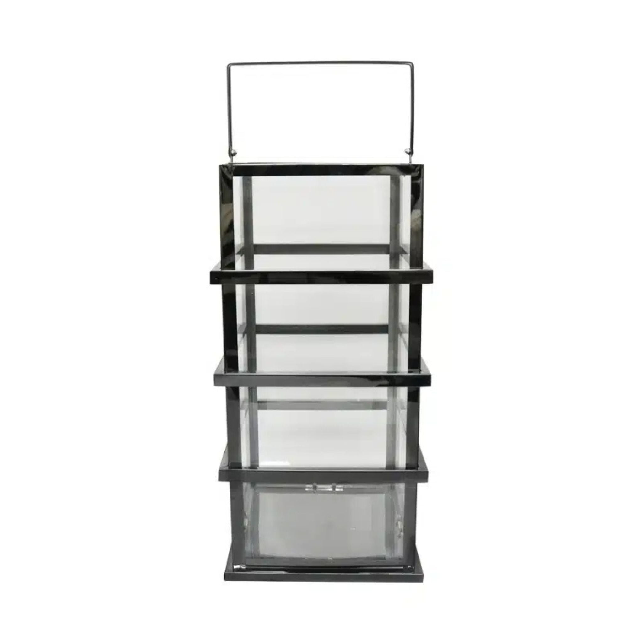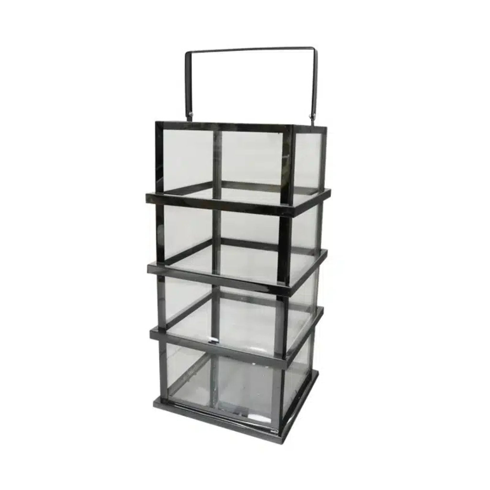 Lantern with square metal frame with handle - glass panels and base. Comes in two colours black nickel and silver. Ideal for a dining or entertaining setting - indoors or al fresco.