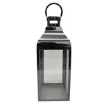 Lantern with rectangle metal frame with handle - glass panes, with one as a door with latch. Comes in two colours black nickel and silver. Ideal for a dining or entertaining setting - indoors or al fresco.