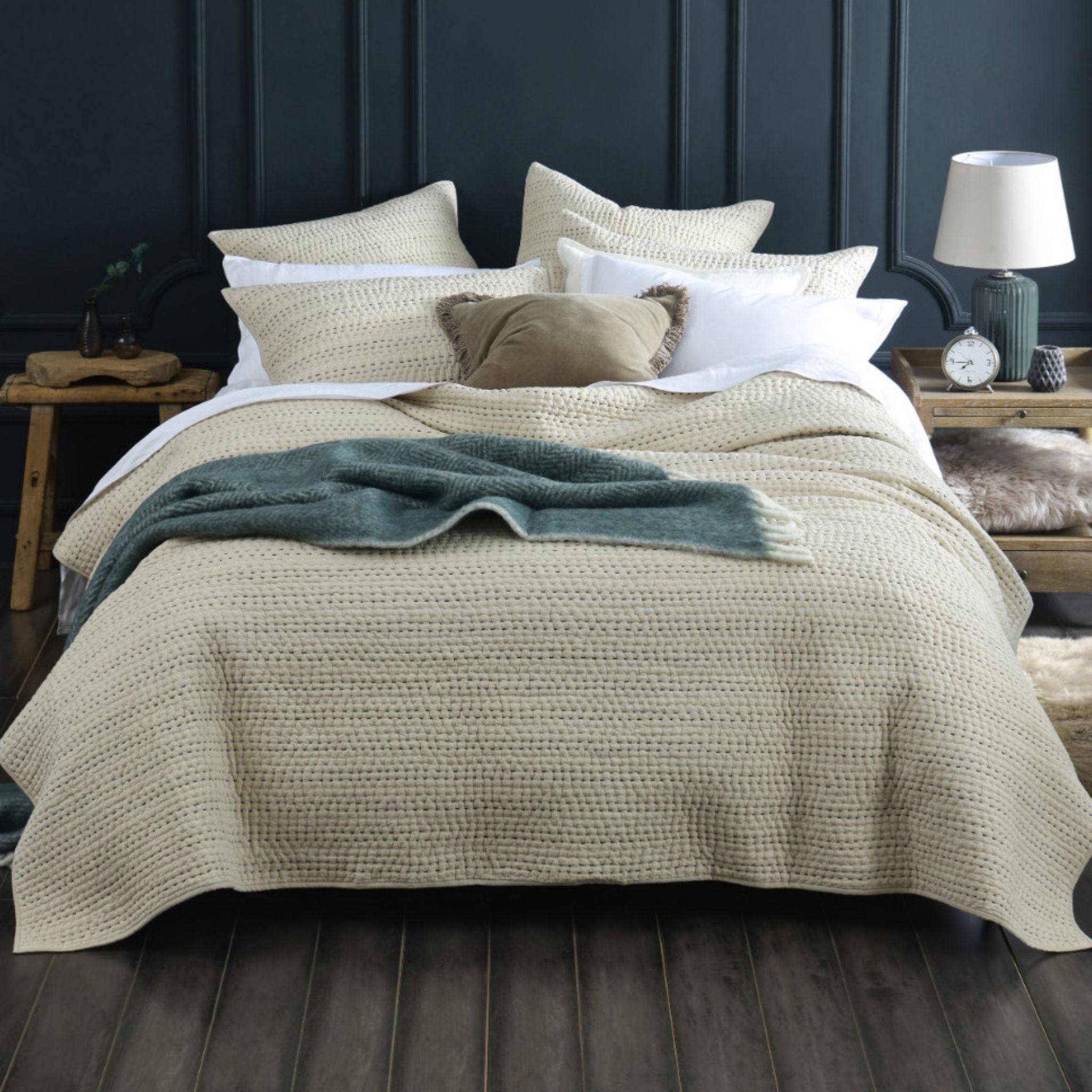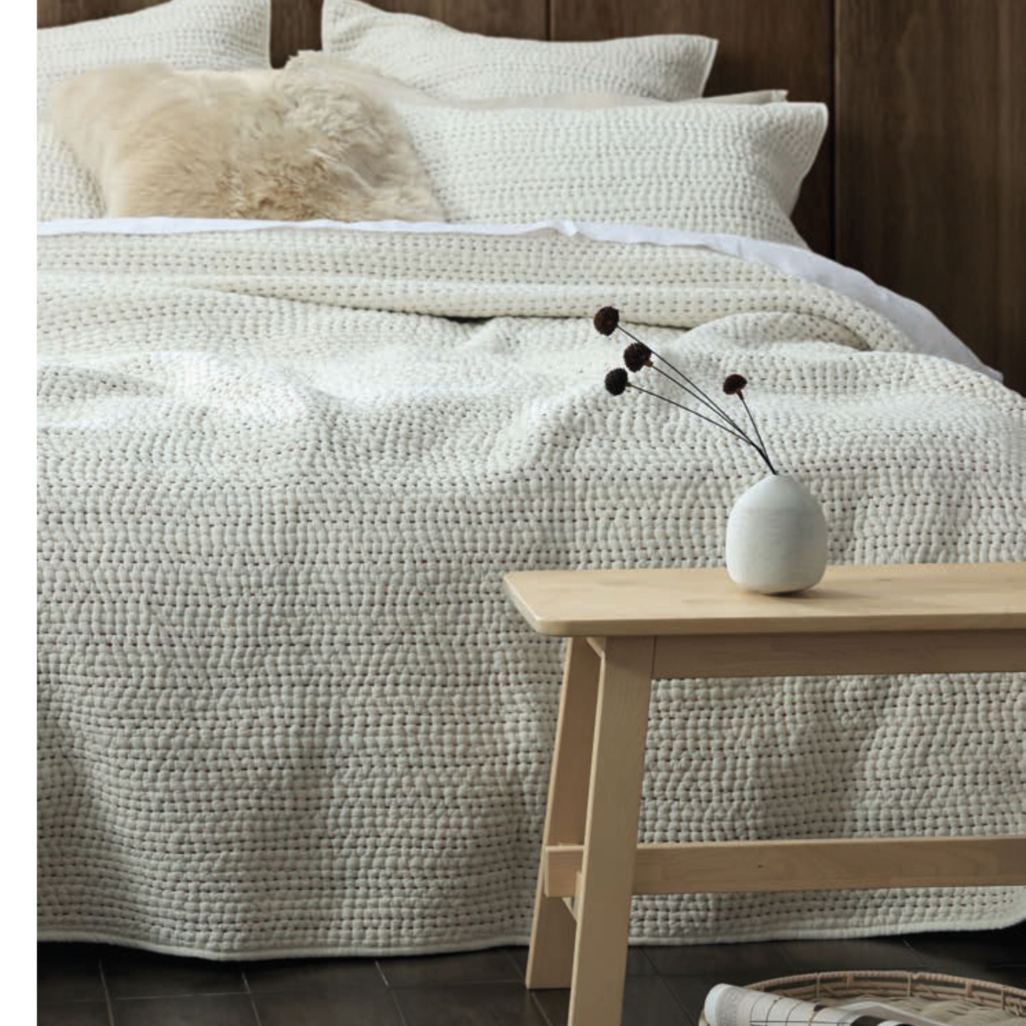 Coverlet - 100% cotton voile with 250 gsm cotton fill - hand stitched. Set includes 2 pillowcases. Available in Large and Medium - and in three colours - Chalk, Oat and Sage
