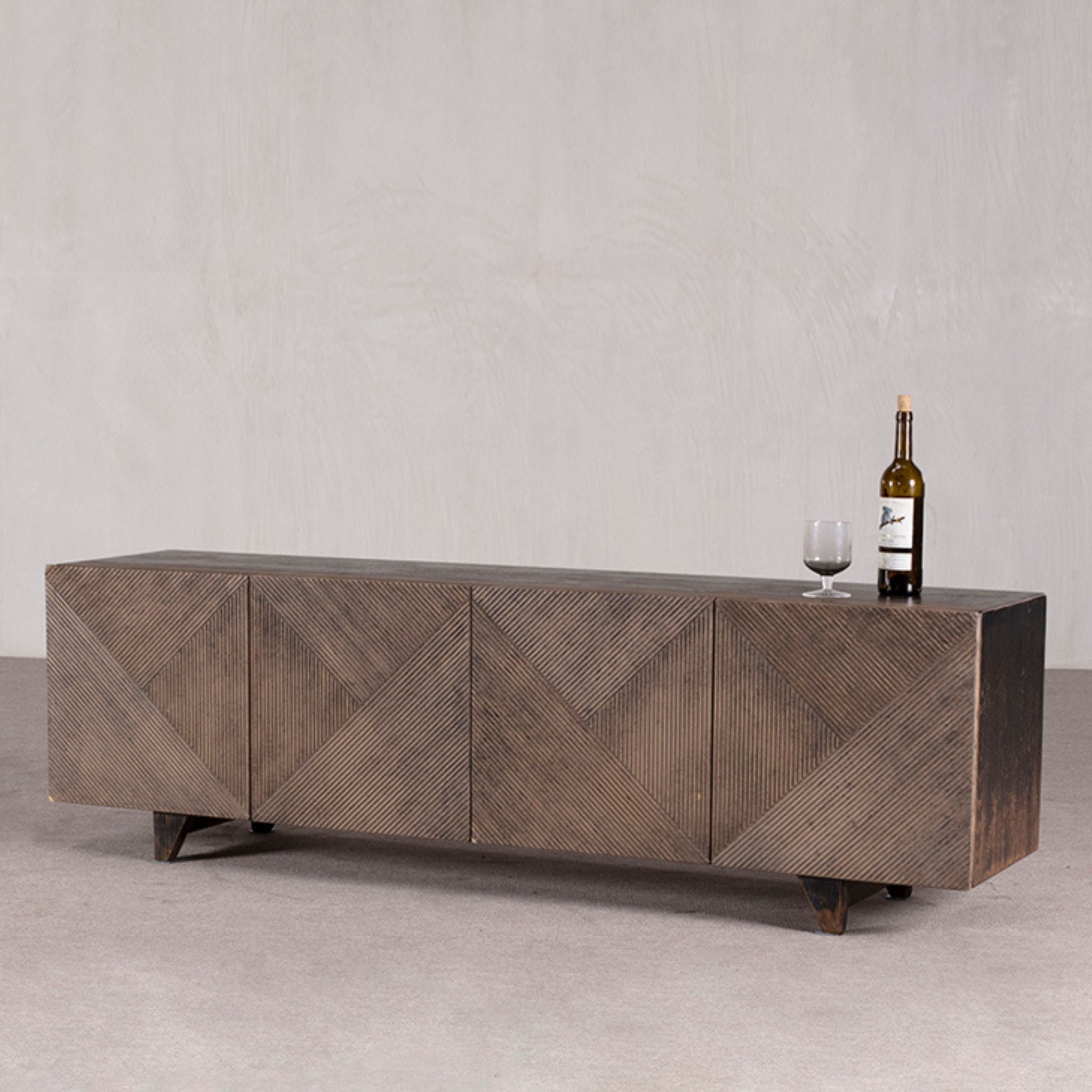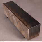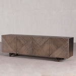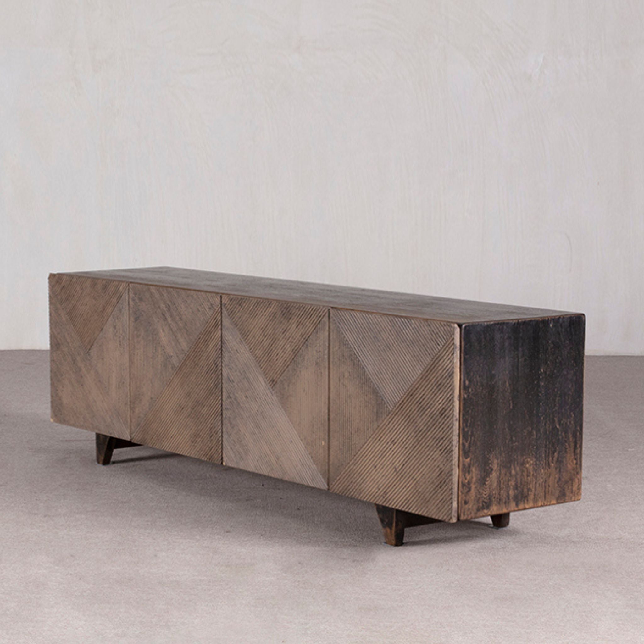 Low cabinet featuring 4 Doors. This stunning modern design - with geometric design panelling feature doors - the finish is in blackwash - allowing the beauty of the wood to shine through