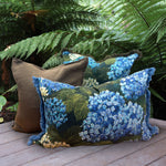 A eye-catching accent cushion - beautiful blue, green and cream hydrangea pattern - ideal for a bedroom or lounge setting. The cover is edged with a blue fringing. Linen cotton blend fabric. Feather inner included