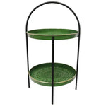 This handy stand, with a handle - has a black metal frame with trays at two height levels. The trays feature an aztec pattern and is in a rich green.