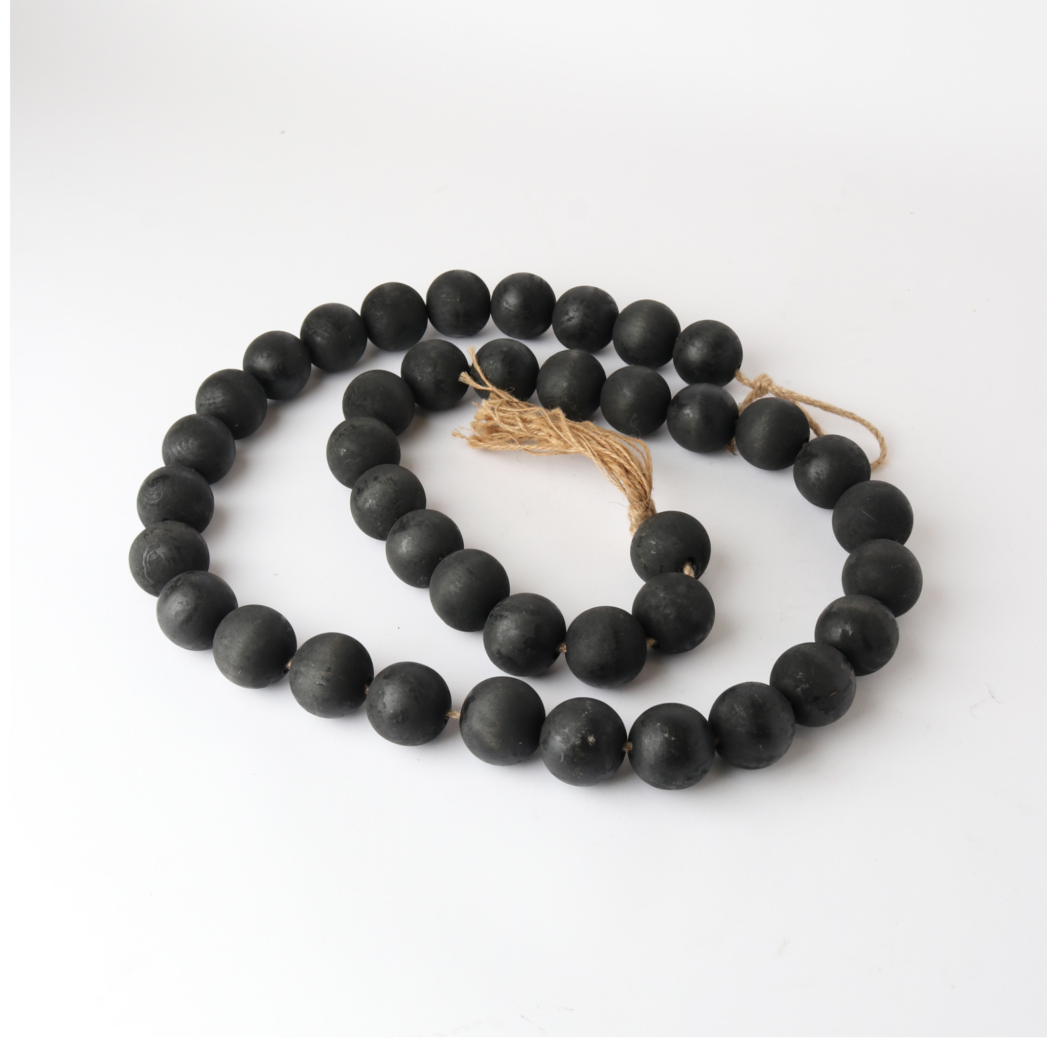Wooden beads on a hessian string with tassel. In black or brown.